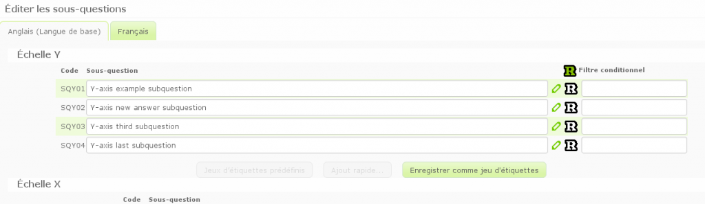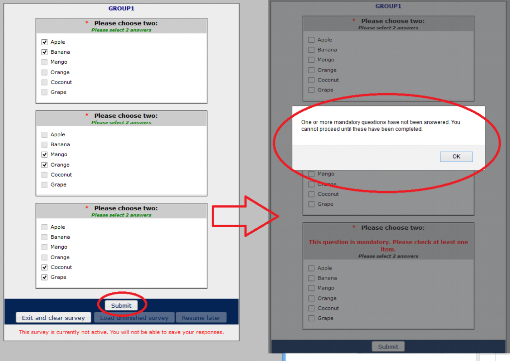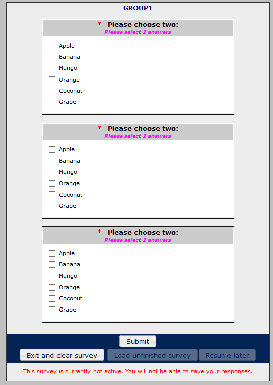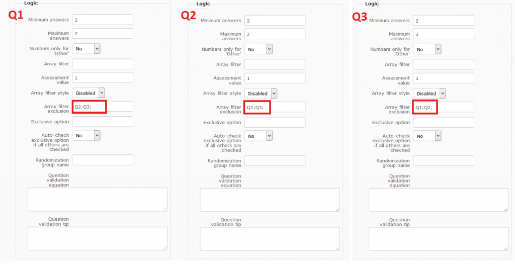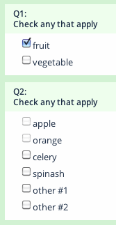 Hi,tpartner wrote: I would be inclined to insert a hidden copy of Q2 (call it qHidden) after Q1 and then use JavaScript to toggle the check-boxes in the hidden question. Corresponding food "group" sub-questions can be identified by the first 4 characters of sub-question codes.
