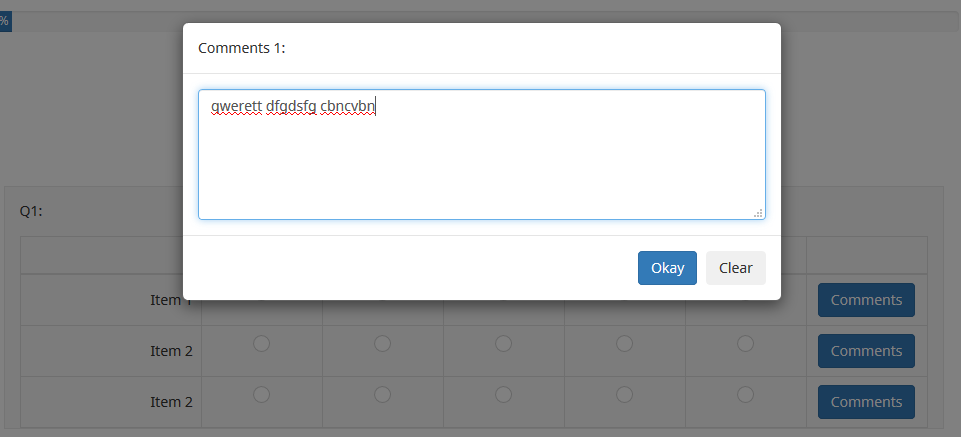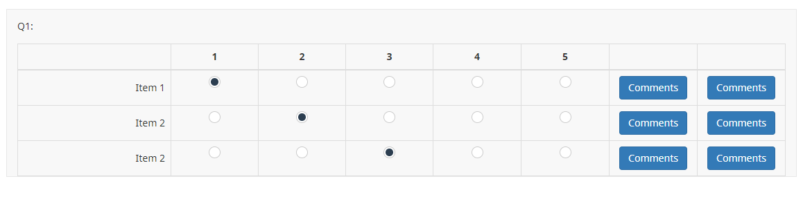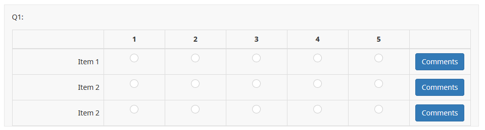 Code:<script type="text/javascript" charset="utf-8"> $(document).on('ready pjax:scriptcomplete',function(){ // Identify the questions var qArrayID = {QID}; var qArray = $('#question'+qArrayID); var arrayLength = $('tr.answers-list', qArray).length; var qComments = qArray.nextAll('.text-long:lt('+arrayLength+')'); // Add some classes qArray.addClass('array-with-comments-question'); $(qComments).each(function(i) { $(this).addClass('comments-question index-'+i).css({ 'position': 'absolute', 'left': '-9999em' }); }); // Insert the comments buttons $('table.questions-list colgroup', qArray).append('<col />'); var tableWidth = $('table.questions-list:eq(0)', qArray).width(); var answerWidth = $('col.ls-col-odd:eq(0)', qArray).width(); var answerWidthPercent = (answerWidth/tableWidth)*100; var answersLength = $('col.ls-col-odd, col.ls-col-even', qArray).length; var answerWidthPercent2 = (answerWidthPercent*answersLength)/(answersLength+1) $('table.questions-list col', qArray).removeAttr('width'); $('table.questions-list col:not(.col-answers)', qArray).css('width', answerWidthPercent2+'%'); $('table.questions-list col:not(.col-answers)', qArray).css('width', 'auto'); $('table.questions-list thead tr', qArray).append('<td />'); $('tr.answers-list', qArray).each(function(i) { $(this).append('<td class="answer-item">\ <button type="button" class="btn btn-primary" data-bs-toggle="modal" data-bs-target="#comments-'+qArrayID+'-'+(i+1)+'" data-backdrop="static" data-keyboard="false">Comments</button>\ </td>'); }); // Handle comments $(qComments).each(function(i) { // Create modals $('body').append('<div class="modal comments-modal" id="comments-'+qArrayID+'-'+(i+1)+'" tabindex="-1" role="dialog">\ <div class="modal-dialog" role="document">\ <div class="modal-content">\ <div class="modal-header">\ <h5 class="modal-title">'+$('.ls-label-question', this).html()+'</h5>\ </div>\ <div class="modal-body">\ </div>\ <div class="modal-footer">\ <button type="button" class="btn btn-primary" data-bs-dismiss="modal">Okay</button>\ <button type="button" class="btn btn-secondary" data-bs-dismiss="modal">Clear</button>\ </div>\ </div>\ </div>\ </div>'); // Move textareas into modals $('#comments-'+qArrayID+'-'+(i+1)+' .modal-body').append($('textarea', this)); // Modal button events $('#comments-'+qArrayID+'-'+(i+1)+' .modal-footer .btn-secondary').on('click', function(e) { $('#comments-'+qArrayID+'-'+(i+1)+' textarea').val(''); }); }); // Interrupt the Next/Submit function (to put comments back in the form) $('#limesurvey').submit(function(e) { $('.comments-modal').each(function(i) { var qID = $('textarea:eq(0)', this).attr('id').split('X')[2]; $('#question'+qID+' .answer-item:eq(0)').append($('textarea:eq(0)', this)); }); }); }); </script>