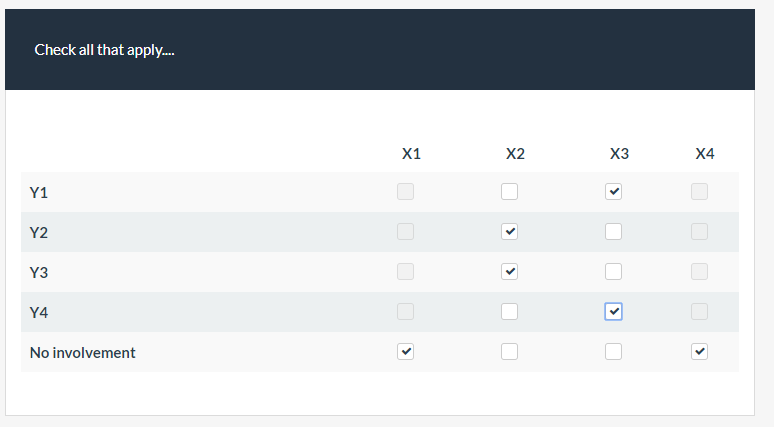 <script type="text/javascript" charset="utf-8"> $(document).ready(function() { var thisQuestion = $('#question{QID}') // Add column-specific classes $('tr.subquestion-list', thisQuestion).each(function(i) { $('th, td', this).each(function(i) { $(this).addClass('column-'+i).attr('data-column', i); }); }); // Add some classes to the checkbox cells $('td.checkbox-item', thisQuestion).addClass('normal-opt'); $('tr.subquestion-list:last td.checkbox-item', thisQuestion).removeClass('normal-opt').addClass('exclusive-opt'); // A listener on the checkboxes $('td.checkbox-item input[type="checkbox"]', thisQuestion).change(function (event) { handleExclusive($(this).closest('td')); }); function handleExclusive(thisCell) { var thisColumn = $(thisCell).attr('data-column'); var thisCheckBox = $('input[type="checkbox"]', thisCell); // Uncheck the appropriate boxes in a row $('.checkbox-item[data-column="'+thisColumn+'"] input[type="checkbox"]').prop('disabled', false); if ($(thisCell).hasClass('normal-opt') && $(thisCheckBox).is(':checked')) { $('.exclusive-opt[data-column="'+thisColumn+'"] input:hidden').val(''); $('.exclusive-opt[data-column="'+thisColumn+'"] input[type="checkbox"]').prop('checked', false); } else if ($(thisCheckBox).is(':checked')) { $('.normal-opt[data-column="'+thisColumn+'"] input:hidden').val(''); $('.normal-opt[data-column="'+thisColumn+'"] input[type="checkbox"]').prop('checked', false).prop('disabled', true); } // Check conditions (relevance) $('td.checkbox-item[data-column="'+thisColumn+'"]').each(function(i) { var thisValue = ''; var itemCheckBox = $('input[type="checkbox"]', this); var thisSGQA = $(itemCheckBox).attr('id').replace(/cbox_/, ''); var aelt = $('#answer'+thisSGQA); fixnum_checkconditions($(aelt).val(), thisSGQA, 'hidden'); checkconditions($(itemCheckBox).attr('value'), $(itemCheckBox).attr('name'), $(itemCheckBox).attr('type')) }); } }); </script>