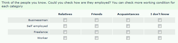 <script type="text/javascript" charset="utf-8"> $(document).ready(function() { // Call the exclude function using question ID excludeOpt({QID}); }); // A function to make the last option in each array row exclusive function excludeOpt (qID) { var thisQuestion = $('#question'+qID) // Add some classes to the checkbox cells $('td.checkbox-item', thisQuestion).addClass('normalOpt'); $('tr.subquestions-list', thisQuestion).each(function(i) { $('.normalOpt:last', this).removeClass('normalOpt').addClass('exlusiveOpt') }); // A listener on the checkbox cells $('td.checkbox-item', thisQuestion).click(function (event) { handleExclusive($(this)); }); // A listener on the checkboxes $('td.checkbox-item input[type="checkbox"]', thisQuestion).click(function (event) { handleExclusive($(this).closest('td')); }); function handleExclusive(thisCell) { var thisRow = $(thisCell).closest('tr'); // Uncheck the appropriate boxes in a row if ($(thisCell).hasClass('normalOpt')) { $('.exlusiveOpt input[type="checkbox"]', thisRow).attr('checked', false); } else { $('.normalOpt input[type="checkbox"]', thisRow).attr('checked', false); } // Check conditions (relevance) $('td.checkbox-item', thisRow).each(function(i) { var thisValue = ''; if($('input[type="checkbox"]', this).is(':checked')) { thisValue = 1; } var thisSGQA = $('input[type="checkbox"]', this).attr('id').replace(/cbox_/, ''); $('input[type="hidden"]', thisRow).attr('value', 'thisValue'); fixnum_checkconditions(thisValue, thisSGQA, 'hidden'); }); } } </script>