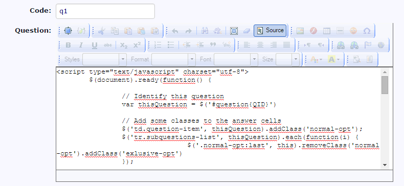 <script type="text/javascript" charset="utf-8"> $(document).ready(function() { // Identify this question var thisQuestion = $('#question{QID}'); // The value recorded in data if last-column checkbox is checked var noAnswer = 99999; // Add some classes to the answer cells $('td.question-item', thisQuestion).addClass('normal-opt'); $('td.question-item:last-child', thisQuestion).removeClass('normal-opt').addClass('exlusive-opt') // Insert the checkboxes $('.exlusive-opt select', thisQuestion).hide(); $('.exlusive-opt', thisQuestion).append('<input type="checkbox" class="checkbox">'); // Insert a new option in the last column selects $('.exlusive-opt select', thisQuestion).append('<option value="'+noAnswer+'">'+noAnswer+'</option>'); // A listener on selects $('.normal-opt select', thisQuestion).on('change', function() { var thisRow = $(this).closest('tr.subquestions-list'); if($(this).val() != ''){ $('.exlusive-opt input[type=checkbox]', thisRow).prop('checked', false); $('.exlusive-opt select', thisRow).val(''); $('.exlusive-opt input[type="hidden"]', thisRow).attr('value', ''); } }); // A listener on the checkboxes $('.exlusive-opt input[type="checkbox"]', thisQuestion).on('change', function(event) { var thisCell = $(this).closest('td.question-item'); var thisRow = $(this).closest('tr.subquestions-list'); if($(this).is(':checked')) { $('select', thisCell).val(noAnswer); $('input[type="hidden"]', thisCell).attr('value', noAnswer); $('.normal-opt select', thisRow).val(''); $('.normal-opt input[type="hidden"]', thisRow).attr('value', ''); } else { $('.exlusive-opt select', thisRow).val(''); $('.exlusive-opt input[type="hidden"]', thisRow).attr('value', ''); } }); // Initial states $('.exlusive-opt input[type="hidden"]', thisQuestion).each(function(i) { var thisCell = $(this).closest('td.question-item'); if($(this).attr('value') == noAnswer) { $('input[type=checkbox]', thisCell).prop('checked', true); $('select', thisCell).val(noAnswer); } }); }); </script>