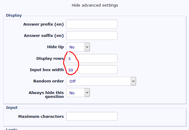 BTW: Firefox will display two rows, even if rows="1" is set for the textarea in the html code.tpartner wrote: (@holch, placing any value in the "Display rows" field will switch the question from text inputs to textareas which allow multiple lines)