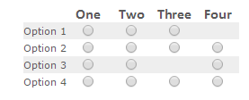 <script type="text/javascript" charset="utf-8"> $(document).ready(function(){ //Hide the last radio in the first row $('#question'+{QID}+' tr.answers-list:first input.radio:last').hide(); //Hide the 3rd radio in the 3rd row $('#question'+{QID}+' tr.answers-list:eq(2) input.radio:eq(2)').hide(); //Hide the first radio of Option 4 $('#answer433587X129X10164-1').hide(); }); </script>