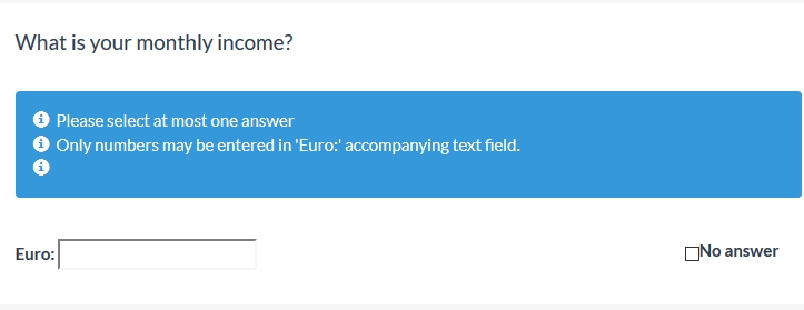 - addding the "other" option and labeling it as "Euro" , so here I should have the income with these options: only numbers and min/max value 1/10000