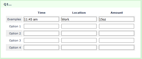 <script type="text/javascript" charset="utf-8"> $(document).ready(function(){ // The example text strings var column1Label = 'Examples'; var column1Example = '11:45 am'; var column2Example = 'Work'; var column3Example = '15oz'; // Identify the question var thisQuestion = $('#question{QID}'); // Create a fake row var newRow = $('tr.subquestion-list:eq(0)', thisQuestion).clone(); $(newRow).addClass('inserted-row'); $('input[type="text"]', newRow).removeAttr('id').removeAttr('name'); $('input[type="hidden"]', newRow).remove(); // Insert the example text strings $('.answertext', newRow).text(column1Label); $('input[type="text"]:eq(0)', newRow).val(column1Example); $('input[type="text"]:eq(1)', newRow).val(column2Example); $('input[type="text"]:eq(2)', newRow).val(column3Example); // Disable the fake row inputs $('input[type="text"]', newRow).prop('readonly', true); // Insert the fake row $('table.questions-list tbody:eq(0)', thisQuestion).prepend(newRow); // Fix up the row classes var rowClass = 1; $('table.subquestions-list tbody tr', thisQuestion).each(function(i) { if($(this).hasClass('sub-header-row')) { rowClass = 1 } else { rowClass++; $(this).removeClass('array1 array2') if(rowClass % 2 == 0) { $(this).addClass('array2'); } else { $(this).addClass('array1'); } } }); }); </script>