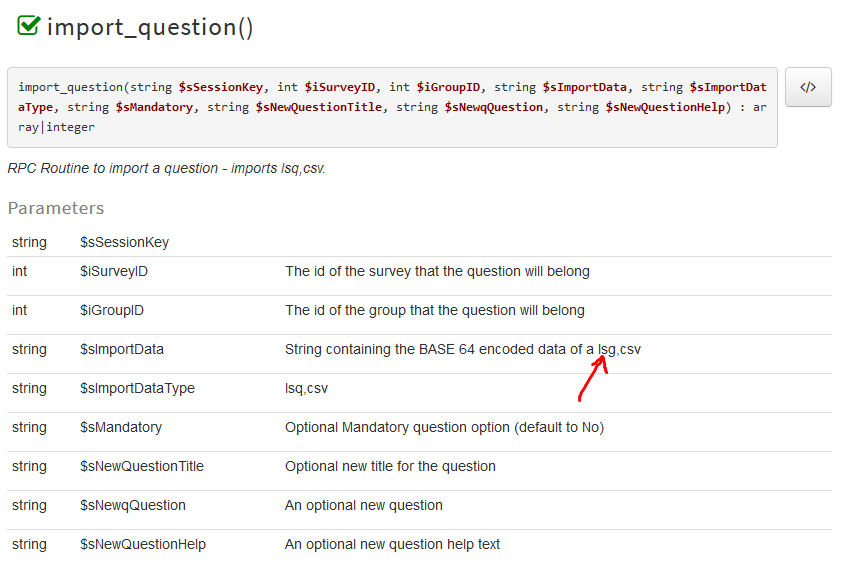 <?php require_once 'jsonRPCClient.php'; define( 'LS_BASEURL', 'https://path/to/limeSurvey/'); define( 'LS_USER', 'adminUsername' ); define( 'LS_PASSWORD', 'adminPassword' ); $iSurveyID = 358123; // The survey ID $iGroupID = 44; // The group ID $sLanguage = 'en'; // The language $sImportData = 'PD94bWwgdmVyc2lvbj0iMS4wIiBlbmNvZGluZz0iVVRGLTgiPz4NCjxkb2N1bWVudD4NCiA8TGltZVN1cnZleURvY1R5cGU+UXVlc3Rpb248L0xpbWVTdXJ2ZXlEb2NUeXBlPg0KIDxEQlZlcnNpb24+MjU3PC9EQlZlcnNpb24+DQogPGxhbmd1YWdlcz4NCiAgPGxhbmd1YWdlPmVuPC9sYW5ndWFnZT4NCiA8L2xhbmd1YWdlcz4NCiA8cXVlc3Rpb25zPg0KICA8ZmllbGRzPg0KICAgPGZpZWxkbmFtZT5xaWQ8L2ZpZWxkbmFtZT4NCiAgIDxmaWVsZG5hbWU+cGFyZW50X3FpZDwvZmllbGRuYW1lPg0KICAgPGZpZWxkbmFtZT5zaWQ8L2ZpZWxkbmFtZT4NCiAgIDxmaWVsZG5hbWU+Z2lkPC9maWVsZG5hbWU+DQogICA8ZmllbGRuYW1lPnR5cGU8L2ZpZWxkbmFtZT4NCiAgIDxmaWVsZG5hbWU+dGl0bGU8L2ZpZWxkbmFtZT4NCiAgIDxmaWVsZG5hbWU+cXVlc3Rpb248L2ZpZWxkbmFtZT4NCiAgIDxmaWVsZG5hbWU+cHJlZzwvZmllbGRuYW1lPg0KICAgPGZpZWxkbmFtZT5oZWxwPC9maWVsZG5hbWU+DQogICA8ZmllbGRuYW1lPm90aGVyPC9maWVsZG5hbWU+DQogICA8ZmllbGRuYW1lPm1hbmRhdG9yeTwvZmllbGRuYW1lPg0KICAgPGZpZWxkbmFtZT5xdWVzdGlvbl9vcmRlcjwvZmllbGRuYW1lPg0KICAgPGZpZWxkbmFtZT5sYW5ndWFnZTwvZmllbGRuYW1lPg0KICAgPGZpZWxkbmFtZT5zY2FsZV9pZDwvZmllbGRuYW1lPg0KICAgPGZpZWxkbmFtZT5zYW1lX2RlZmF1bHQ8L2ZpZWxkbmFtZT4NCiAgIDxmaWVsZG5hbWU+cmVsZXZhbmNlPC9maWVsZG5hbWU+DQogICA8ZmllbGRuYW1lPm1vZHVsZW5hbWU8L2ZpZWxkbmFtZT4NCiAgPC9maWVsZHM+DQogIDxyb3dzPg0KICAgPHJvdz4NCiAgICA8cWlkPjwhW0NEQVRBWzUyMV1dPjwvcWlkPg0KICAgIDxwYXJlbnRfcWlkPjwhW0NEQVRBWzBdXT48L3BhcmVudF9xaWQ+DQogICAgPHNpZD48IVtDREFUQVszNTgxMjNdXT48L3NpZD4NCiAgICA8Z2lkPjwhW0NEQVRBWzQ0XV0+PC9naWQ+DQogICAgPHR5cGU+PCFbQ0RBVEFbU11dPjwvdHlwZT4NCiAgICA8dGl0bGU+PCFbQ0RBVEFbUXh4XV0+PC90aXRsZT4NCiAgICA8cXVlc3Rpb24+PCFbQ0RBVEFbPHA+UTEuLi48L3A+DQpdXT48L3F1ZXN0aW9uPg0KICAgIDxwcmVnLz4NCiAgICA8aGVscC8+DQogICAgPG90aGVyPjwhW0NEQVRBW05dXT48L290aGVyPg0KICAgIDxtYW5kYXRvcnk+PCFbQ0RBVEFbTl1dPjwvbWFuZGF0b3J5Pg0KICAgIDxxdWVzdGlvbl9vcmRlcj48IVtDREFUQVs2XV0+PC9xdWVzdGlvbl9vcmRlcj4NCiAgICA8bGFuZ3VhZ2U+PCFbQ0RBVEFbZW5dXT48L2xhbmd1YWdlPg0KICAgIDxzY2FsZV9pZD48IVtDREFUQVswXV0+PC9zY2FsZV9pZD4NCiAgICA8c2FtZV9kZWZhdWx0PjwhW0NEQVRBWzBdXT48L3NhbWVfZGVmYXVsdD4NCiAgICA8cmVsZXZhbmNlLz4NCiAgICA8bW9kdWxlbmFtZS8+DQogICA8L3Jvdz4NCiAgPC9yb3dzPg0KIDwvcXVlc3Rpb25zPg0KIDxxdWVzdGlvbl9hdHRyaWJ1dGVzPg0KICA8ZmllbGRzPg0KICAgPGZpZWxkbmFtZT5xaWQ8L2ZpZWxkbmFtZT4NCiAgIDxmaWVsZG5hbWU+YXR0cmlidXRlPC9maWVsZG5hbWU+DQogICA8ZmllbGRuYW1lPnZhbHVlPC9maWVsZG5hbWU+DQogICA8ZmllbGRuYW1lPmxhbmd1YWdlPC9maWVsZG5hbWU+DQogIDwvZmllbGRzPg0KICA8cm93cz4NCiAgIDxyb3c+DQogICAgPHFpZD48IVtDREFUQVs1MjFdXT48L3FpZD4NCiAgICA8YXR0cmlidXRlPjwhW0NEQVRBW3ByZWZpeF1dPjwvYXR0cmlidXRlPg0KICAgIDx2YWx1ZT48IVtDREFUQVtQcmVmaXggdGV4dF1dPjwvdmFsdWU+DQogICAgPGxhbmd1YWdlPjwhW0NEQVRBW2VuXV0+PC9sYW5ndWFnZT4NCiAgIDwvcm93Pg0KICAgPHJvdz4NCiAgICA8cWlkPjwhW0NEQVRBWzUyMV1dPjwvcWlkPg0KICAgIDxhdHRyaWJ1dGU+PCFbQ0RBVEFbc3RhdGlzdGljc19ncmFwaHR5cGVdXT48L2F0dHJpYnV0ZT4NCiAgICA8dmFsdWU+PCFbQ0RBVEFbNV1dPjwvdmFsdWU+DQogICA8L3Jvdz4NCiAgIDxyb3c+DQogICAgPHFpZD48IVtDREFUQVs1MjFdXT48L3FpZD4NCiAgICA8YXR0cmlidXRlPjwhW0NEQVRBW3N1ZmZpeF1dPjwvYXR0cmlidXRlPg0KICAgIDx2YWx1ZT48IVtDREFUQVtTdWZmaXggdGV4dF1dPjwvdmFsdWU+DQogICAgPGxhbmd1YWdlPjwhW0NEQVRBW2VuXV0+PC9sYW5ndWFnZT4NCiAgIDwvcm93Pg0KICA8L3Jvd3M+DQogPC9xdWVzdGlvbl9hdHRyaWJ1dGVzPg0KPC9kb2N1bWVudD4NCg=='; // The Base64 Encoded lsq file $sImportDataType = 'lsq'; // Data type $sMandatory = 'N'; // Question mandatory? (optional) $sNewQuestionTitle = 'Q66'; // New question code (optional) $sNewqQuestion = 'This is new question text...'; // New text (optional) $sNewQuestionHelp = 'Some new question help...'; // New help text (optional) if(ctype_alnum($iSurveyID) && strlen($iSurveyID) == 6) { // Valid iSurveyID format // Instantiate a new RPC client $myJSONRPCClient = new jsonRPCClient( LS_BASEURL.'/index.php/admin/remotecontrol' ); // Get a session key $sSessionKey= $myJSONRPCClient->get_session_key( LS_USER, LS_PASSWORD ); // Add new question $newQuestion = $myJSONRPCClient->import_question($sSessionKey, $iSurveyID, $iGroupID, $sImportData, $sImportDataType, $sMandatory, $sNewQuestionTitle, $sNewqQuestion, $sNewQuestionHelp); // Release the session key $myJSONRPCClient->release_session_key( $sSessionKey ); } else { // Invalid iSurveyID format die( 'Invalid format!' ); } ?>
