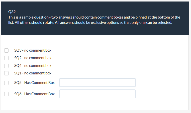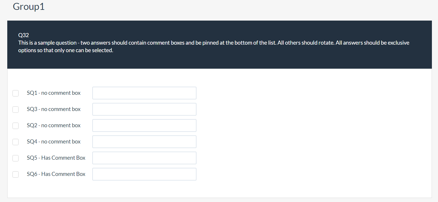 <script type="text/javascript" charset="utf-8"> $(document).ready(function() { // Identify this question var qID = {QID}; // The sub-question codes to have no text input var sqCodes = [1, 2, 3, 4]; // Loop through those sq codes and remove their text inputs $(sqCodes).each(function(i, code) { $('#question'+qID+' input[type="text"][id$="X7441'+code+'comment"]').remove(); }); // The number of answers to be fixed at the end of the list var fixedAnswers = 2; // Find the number of answers var ansCount = $('#question'+qID+' .answer-item').length; // Place the last n answers created at the end of the list var fixedIndex = fixedAnswers - 1; for (var i=0; i<fixedAnswers; i++) { var answer = $('input[id^="answer"][id$="X'+qID+(ansCount-fixedIndex)+'"]'); var answerItem = $(answer).closest('.answer-item'); var answersList = $(answer).closest('.answers-list'); if($('#question'+qID).hasClass('multiple-opt')) { answerItem = $(answer).closest('.answer-item').parent(); answersList = $(answer).closest('.subquestion-list'); } if($('#question'+qID).hasClass('multiple-opt-comments')) { answersList = $(answer).closest('tbody'); } $(answersList).append(answerItem); fixedIndex--; } }); </script>