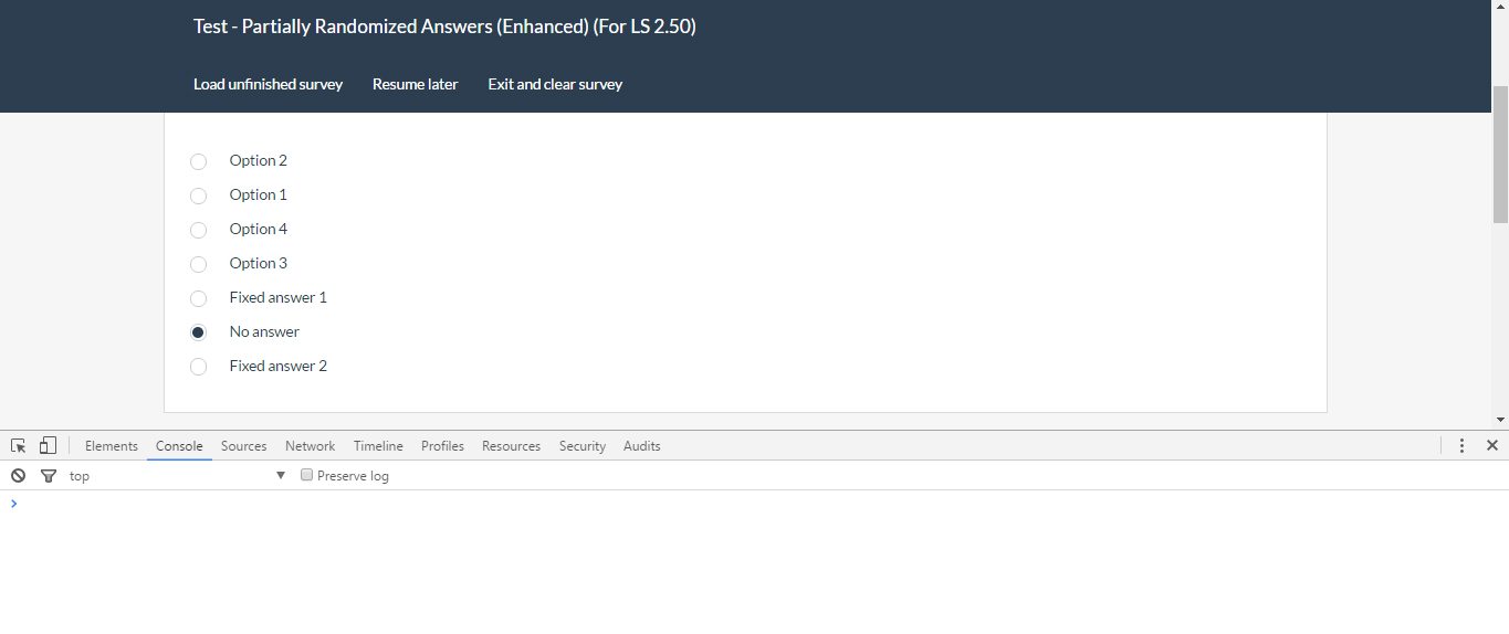 <script type="text/javascript" charset="utf-8"> $(document).ready(function() { // The number of answers to be fixed at the end of the list var fixedAnswers = 2; // Identify this question var qID = {QID}; // Find the number of answers var ansCount = $('#question'+qID+' .answer-item').length; // Place the last n answers created at the end of the list var fixedIndex = fixedAnswers - 1; for (var i=0; i<fixedAnswers; i++) { var answer = $('input[id^="answer"][id$="X'+qID+(ansCount-fixedIndex)+'"]'); var answerItem = $(answer).closest('.answer-item'); var answersList = $(answer).closest('.answers-list'); if($('#question'+qID).hasClass('multiple-opt')) { answerItem = $(answer).closest('.answer-item').parent(); answersList = $(answer).closest('.subquestion-list'); } $(answersList).append(answerItem); fixedIndex--; } }); </script>