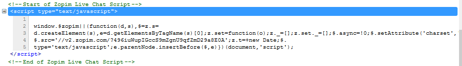 <!--Start of Zopim Live Chat Script--> <script type="text/javascript"> window.$zopim||(function(d,s){ var z=$zopim=function(c){ z._.push(c) }, $=z.s=d.createElement(s), e=d.getElementsByTagName(s)[0]; z.set=function(o){ z.set._.push(o) }; z._=[]; z.set._=[]; $.async=!0; $.setAttribute("charset","utf-8"); $.src="//v2.zopim.com/?496iuWupIGccS9mZgnU9qfZmD29a8E0A"; z.t=+new Date; $.type="text/javascript";e.parentNode.insertBefore($,e) })(document,"script"); </script> <!--End of Zopim Live Chat Script-->