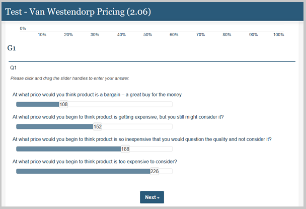 function shuffleArray(array) { for (var i = array.length - 1; i > 0; i--) { var j = Math.floor(Math.random() * (i + 1)); var temp = array[i]; array[i] = array[j]; array[j] = temp; } return array; } /***** A jQuery plugin to facilitate the Van Westendorp pricing research methodology Copyright (C) 2016 - Tony Partner (https://partnersurveys.com) Licensed MIT, GPL Version - 2.0 Create date - 19/10/16 *****/ (function( $ ){ $.fn.vWPricing25 = function(options) { var opts = $.extend( { order: [1, 2, 3, 4], randomOrder: false }, options); return this.each(function() { var thisQuestion = $(this); thisQuestion.addClass('vwp-question'); // Add some attributes and set the slider max/min values var itemsLength = $('.question-item', thisQuestion).length; $('.question-item', thisQuestion).each(function(i) { var thisInput = $('input[type=text]', this); var thisVal = $(thisInput).val(); $(this).attr('data-item', (i+1)); $(thisInput).attr('data-bs-slider-index', (i+1)); // Slider initial settings setTimeout(function() { var thisSliderMin = $(thisInput).bootstrapSlider('getAttribute', 'min'); $(thisInput).bootstrapSlider('setAttribute', 'min', thisSliderMin+(i)); var thisSliderMax = $(thisInput).bootstrapSlider('getAttribute', 'max'); $(thisInput).bootstrapSlider('setAttribute', 'max', thisSliderMax-((itemsLength-1)-i)); if(thisVal == '') { $(thisInput).val(''); } }, 200); }); // Slider order if(opts.randomOrder == true) { shuffleArray(opts.order); } $(opts.order).each(function(i, val) { $('.subquestion-list.questions-list', thisQuestion).append($('.question-item[data-item="'+val+'"]', thisQuestion)); }); // Listeners on the sliders $('input[type=text]', thisQuestion).on('slide', function(event) { handleVwpSliders(this, $(this).bootstrapSlider('getValue')); }); $('input[type=text]', thisQuestion).on('slideStop', function(event) { handleVwpSliders(this, $(this).bootstrapSlider('getValue')); }); // A function to handle the siders function handleVwpSliders(el, sliderVal) { var movedIndexNum = $(el).attr('data-bs-slider-index'); var lowerSliders = $('input[type=text]', thisQuestion).filter(function() { return $(this).attr('data-bs-slider-index') < movedIndexNum; }); var higherSliders = $('input[type=text]', thisQuestion).filter(function() { return $(this).attr('data-bs-slider-index') > movedIndexNum; }); $(lowerSliders).each(function(i) { var thisIndexNum = $(this).attr('data-bs-slider-index'); var newSliderVal = sliderVal-(movedIndexNum-thisIndexNum); if($(this).bootstrapSlider('getValue') > newSliderVal) { var thisRow = $(this).closest('.question-item'); var thisTooltip = $('.tooltip', thisRow); $(this).bootstrapSlider('setValue', newSliderVal); $('.tooltip-inner', thisTooltip).text($('input.text', thisRow).val()); thisTooltip.show().css('margin-left', '-'+(thisTooltip.width()/2)+'px'); var validationInput = $('input.em_sq_validation', thisRow); $(validationInput).val($('input.text', thisRow).val()) fixnum_checkconditions($(validationInput).attr('value'), $(validationInput).attr('name'), $(validationInput).attr('type')); } }); $(higherSliders).each(function(i) { var thisIndexNum = $(this).attr('data-bs-slider-index'); var newSliderVal = sliderVal+(thisIndexNum-movedIndexNum); if($(this).bootstrapSlider('getValue') < newSliderVal) { var thisRow = $(this).closest('.question-item'); var thisTooltip = $('.tooltip', thisRow); $(this).bootstrapSlider('setValue', newSliderVal); $('.tooltip-inner', thisTooltip).text($('input.text', thisRow).val()); thisTooltip.show().css('margin-left', '-'+(thisTooltip.width()/2)+'px'); var validationInput = $('input.em_sq_validation', thisRow); $(validationInput).val($('input.text', thisRow).val()) fixnum_checkconditions($(validationInput).attr('value'), $(validationInput).attr('name'), $(validationInput).attr('type')); } }); } // Listener on resizing (override the bootstrap callout behaviour) $(window).resize(function() { setTimeout(function() { $('input[type=text]', thisQuestion).each(function(i) { if($(this).val() != '') { var thisRow = $(this).closest('.question-item'); var thisTooltip = $('.tooltip', thisRow); $('.tooltip-inner', thisTooltip).text($.trim($(this).val())); thisTooltip.show().css('margin-left', '-'+(thisTooltip.width()/2)+'px'); } }); }, 1); }); }); }; })( jQuery );