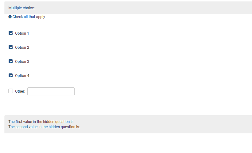 <script type="text/javascript" charset="utf-8"> $(document).ready(function() { // Identify the questions var thisQuestion = $('#question{QID}'); var thisQuestionID = {QID}; var qHidden = thisQuestion.nextAll('.multiple-short-txt:eq(0)'); var hiddenInput1 = $('input.text:eq(0)', qHidden); var hiddenInput2 = $('input.text:eq(1)', qHidden); var qHidden2 = thisQuestion.nextAll('.multiple-opt:eq(0)'); var qHidden2ID = qHidden2.attr('id').replace(/question/, ''); // Hide the control questions qHidden.hide(); qHidden2.hide(); // Listener on the checkboxes $('input.checkbox', thisQuestion).on('change', function(e) { handleChecked(); }); function handleChecked() { // Build an array of checked sub-question codes var checkedAnswers = []; $('input.checkbox:checked', thisQuestion).each(function(i) { var thisSQCode = $(this).attr('id').split('X'+thisQuestionID)[1]; checkedAnswers.push(thisSQCode); }); // Shuffle the array shuffleArray(checkedAnswers); // Reset the hidden multi-choice $('input.checkbox', qHidden2).each(function(i) { $(this).prop('checked', false); $(this).nextAll('input:hidden:eq(0)').val(''); }); // Load the hidden questions with 2 random items from the visible multi-choice $(hiddenInput1).val($.trim($('.question-item[id$="X'+thisQuestionID+checkedAnswers[0]+'"] .label-text').text())); $('input.checkbox[id$="X'+qHidden2ID+checkedAnswers[0]+'"]', qHidden2).trigger('click'); if(checkedAnswers.length > 1) { $(hiddenInput2).val($.trim($('.question-item[id$="X'+thisQuestionID+checkedAnswers[1]+'"] .label-text').text())); $('input.checkbox[id$="X'+qHidden2ID+checkedAnswers[1]+'"]', qHidden2).trigger('click'); } else { $(hiddenInput2).val(''); } // Fire Expression Manager checkconditions(hiddenInput1.value, hiddenInput1.name, hiddenInput1.type); checkconditions(hiddenInput2.value, hiddenInput2.name, hiddenInput2.type); $('input.checkbox', qHidden2).each(function(i) { checkconditions(this.value, this.name, this.type); }); } }); function shuffleArray(array) { for (var i = array.length - 1; i > 0; i--) { var j = Math.floor(Math.random() * (i + 1)); var temp = array[i]; array[i] = array[j]; array[j] = temp; } return array; } </script>