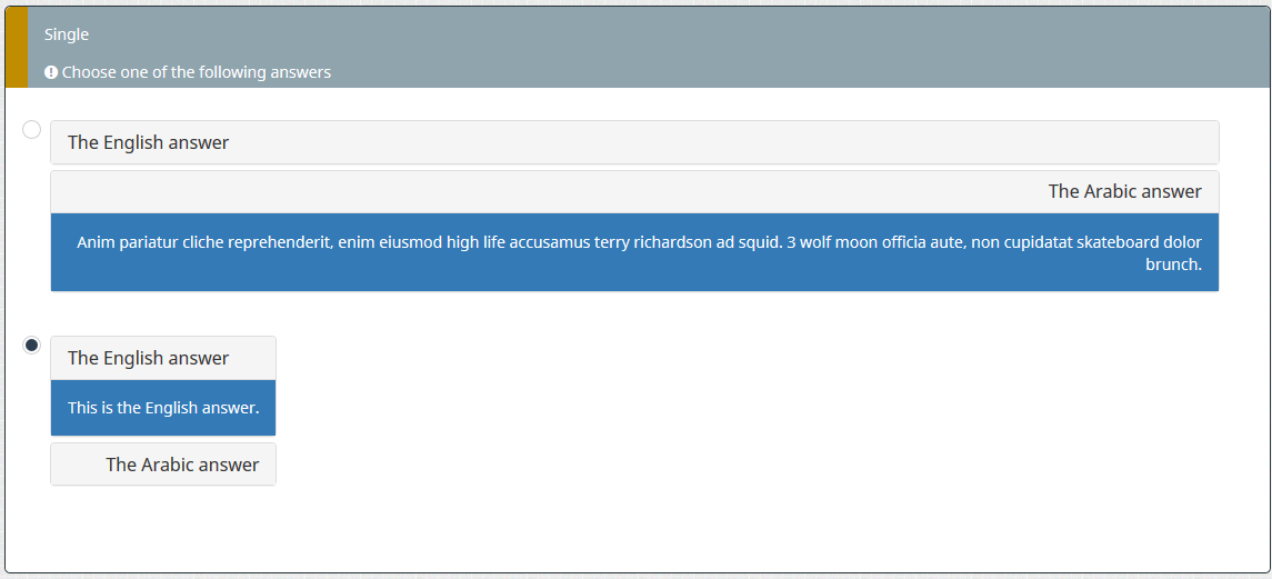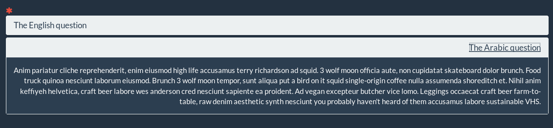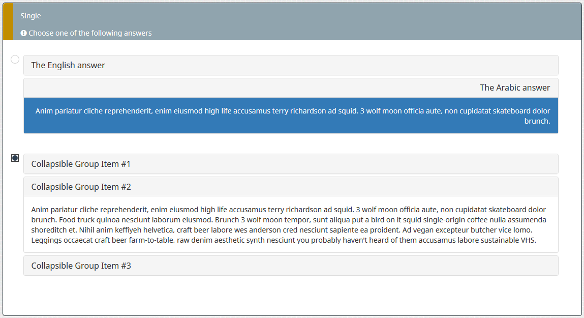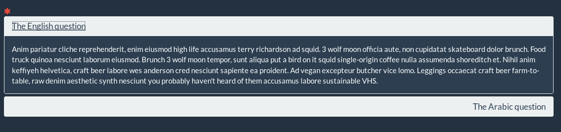 <div class="panel-group" id="accordion-{QID}" role="tablist" aria-multiselectable="true"> <div class="panel panel-default"> <div class="panel-heading" role="tab" id="heading-en"> <h4 class="panel-title" lang="en" dir="ltr" > <a role="button" data-toggle="collapse" data-parent="#accordion-{QID}" href="#collapse-en" aria-expanded="true" aria-controls="collapse-en"> The English question </a> </h4> </div> <div id="collapse-en" class="panel-collapse collapse in" role="tabpanel" aria-labelledby="heading-en"> <div class="panel-body bg-primary" lang="en" dir="ltr"> Anim pariatur cliche reprehenderit, enim eiusmod high life accusamus terry richardson ad squid. 3 wolf moon officia aute, non cupidatat skateboard dolor brunch. Food truck quinoa nesciunt laborum eiusmod. Brunch 3 wolf moon tempor, sunt aliqua put a bird on it squid single-origin coffee nulla assumenda shoreditch et. Nihil anim keffiyeh helvetica, craft beer labore wes anderson cred nesciunt sapiente ea proident. Ad vegan excepteur butcher vice lomo. Leggings occaecat craft beer farm-to-table, raw denim aesthetic synth nesciunt you probably haven't heard of them accusamus labore sustainable VHS. </div> </div> </div> <div class="panel panel-default"> <div class="panel-heading" role="tab" id="heading-ar"> <h4 class="panel-title text-right" lang="ar" dirt="rtl"> <a class="collapsed" role="button" data-bs-toggle="collapse" data-parent="#accordion-{QID}" href="#collapse-ar" aria-expanded="false" aria-controls="collapse-ar"> The Arabic question </a> </h4> </div> <div id="collapse-ar" class="panel-collapse collapse" role="tabpanel" aria-labelledby="heading-ar"> <div class="panel-body bg-primary text-right" lang="ar" dirt="rtl"> Anim pariatur cliche reprehenderit, enim eiusmod high life accusamus terry richardson ad squid. 3 wolf moon officia aute, non cupidatat skateboard dolor brunch. Food truck quinoa nesciunt laborum eiusmod. Brunch 3 wolf moon tempor, sunt aliqua put a bird on it squid single-origin coffee nulla assumenda shoreditch et. Nihil anim keffiyeh helvetica, craft beer labore wes anderson cred nesciunt sapiente ea proident. Ad vegan excepteur butcher vice lomo. Leggings occaecat craft beer farm-to-table, raw denim aesthetic synth nesciunt you probably haven't heard of them accusamus labore sustainable VHS. </div> </div> </div> </div>
