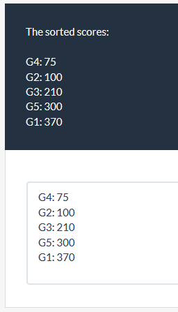 <script type="text/javascript" charset="utf-8"> $(document).ready(function() { // Identify this question var thisQuestion = $('#question{QID}'); // Define the group scores var scores = { G1: 370, G2: 100, G3: 210, G4: 75, G5: 300 }; // Sort the array var tuples = []; for (var key in scores) tuples.push([key, scores[key]]); tuples.sort(function(a, b) { a = a[1]; b = b[1]; return a < b ? -1 : (a > b ? 1 : 0); }); // Loop through the sorted array for (var i = 0; i < tuples.length; i++) { var key = tuples[i][0]; var value = tuples[i][1]; // Display in question text $('.question-text', thisQuestion).append('<br />'+key+': '+value+''); // Insert into textarea $('textarea', thisQuestion).val($('textarea', thisQuestion).val()+key+': '+value+'\n'); } }); </script>