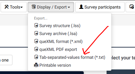 I have read the manual part above, but have not yet an idea of what the structure really looks like. So I tried to set up a sample survey. I do not finde export to tab separated values, though.