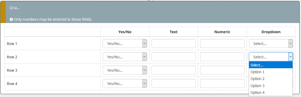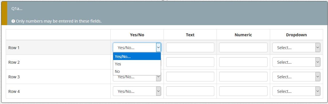 <script type="text/javascript" charset="utf-8"> $(document).on('ready pjax:scriptcomplete',function(){ var thisQuestion = $('#question{QID}'); // Insert selects $('.answer-item.answer_cell_X001', thisQuestion).addClass('with-select').append('<select class="inserted-select form-control list-question-select">\ <option value="">Yes/No...</option>\ <option value="1">Yes</option>\ <option value="2">No</option>\ </select>'); $('.answer-item.answer_cell_X004', thisQuestion).addClass('with-select').append('<select class="inserted-select form-control list-question-select">\ <option value="">Select...</option>\ <option value="1">Option 1</option>\ <option value="2">Option 2</option>\ <option value="3">Option 3</option>\ <option value="4">Option 4</option>\ </select>'); // Listeners $('.inserted-select', thisQuestion).on('change', function(i) { if($(this).val() != '') { $(this).closest('.answer-item').find('input:text').val($.trim($('option:selected', this).text())).trigger('change'); } else { $(this).closest('.answer-item').find('input:text').val('').trigger('change'); } }); // Returning to page $('.with-select input:text', thisQuestion).each(function(i) { var thisCell = $(this).closest('.answer-item'); var inputText = $.trim($(this).val()); var selectval = $('select.inserted-select option', thisCell).filter(function () { return $(this).html() == inputText; }).val(); $('select.inserted-select', thisCell).val(selectval); }); // Clean-up styles $('select.inserted-select', thisQuestion).css({ 'max-width': '100%' }); $('.with-select input:text', thisQuestion).css({ 'position': 'absolute', 'left': '-9999em' }); }); </script>