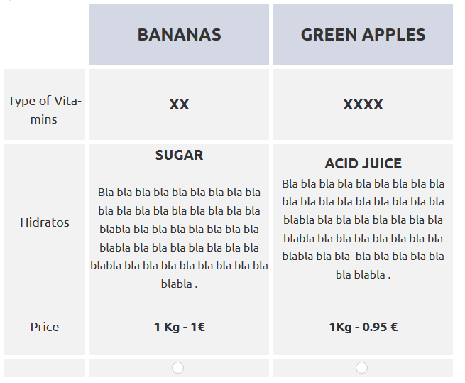 <table border="0" cellpadding="0" cellspacing="0" style="border-collapse:collapse;"> <tbody> <tr> <td style="text-align: center;" width="0%"> </td> <td style="text-align: center;" width="0%"> </td> <td bgcolor="#D4D7E4" style="text-align: center;" width="40%"><br /> <span style="font-size:24px;"><strong>BANANAS</strong></span><br /> </td> <td style="text-align: center;" width="0%"> </td> <td bgcolor="#D4D7E4" style="text-align: center;" width="40%"><span style="font-size:24px;"><strong>GREEN APPLES</strong></span></td> </tr> <tr style="height: 6px; text-align: center;"> </tr> <tr> <td bgcolor="#f2f2f2" style="text-align: center;"> <p><span style="font-size:12px;"> </span><br /> <span style="font-size:18px;">Type of Vitamins</span><span style="font-size:12px;"> </span></p> </td> <td style="text-align: center;" width="0%"> </td> <td bgcolor="#f2f2f2" style="text-align: center;"> <p> </p> <div><span style="font-size:20px;"><strong>XX</strong></span></div> <p> </p> </td> <td style="text-align: center;" width="0%"> </td> <td bgcolor="#f2f2f2" style="text-align: center;"><span style="font-size:20px;"><strong>XXXX</strong></span></td> </tr> <tr style="height: 6px; text-align: center;"> </tr> <tr> <td bgcolor="#f2f2f2" style="text-align: center;"><span style="font-size:18px;">Hidratos</span></td> <td style="text-align: center;" width="0%"> </td> <td bgcolor="#f2f2f2" style="text-align: center;"> <p><span style="font-size:20px;"><strong>SUGAR</strong></span><br /> <br /> <span style="font-size:16px;">Bla bla bla bla bla bla bla bla bla bla bla bla bla bla bla bla bla bla blabla bla bla bla bla bla bla bla blabla bla bla bla bla bla bla bla blabla bla bla bla bla bla bla bla bla blabla .</span></p> </td> <td style="text-align: center;" width="0%"> </td> <td bgcolor="#f2f2f2"> <p style="text-align: center;"><span style="font-size: 20px;"><b>ACID JUICE</b></span><br /> <span style="font-size:16px;">Bla bla bla bla bla bla bla bla bla bla bla bla bla bla bla bla bla bla blabla bla bla bla bla bla bla bla blabla bla bla bla bla bla bla bla blabla bla bla bla bla bla bla bla bla blabla .</span></p> </td> </tr> <tr> <td bgcolor="#f2f2f2" style="text-align: center;"><span style="font-size:18px;">Price</span></td> <td style="text-align: center;" width="1%"> </td> <td bgcolor="#f2f2f2" style="text-align: center;"><br /> <b>1 Kg - 1€</b><br /> </td> <td style="text-align: center;" width="1%"> </td> <td bgcolor="#f2f2f2" style="text-align: center;"><strong>1Kg - 0.95 €</strong></td> </tr> <tr style="height: 6px; text-align: center;"> <td colspan="5"></td> </tr> <tr> <td bgcolor="#f2f2f2" style="text-align: center;"></td> <td style="text-align: center;" width="0%"> </td> <td bgcolor="#f2f2f2" style="text-align: center;"></td> <td style="text-align: center;" width="0%"> </td> <td bgcolor="#f2f2f2"></td> </tr> </tbody> </table> <script type="text/javascript" charset="utf-8"> $(document).on('ready pjax:scriptcomplete',function(){ // Identify this question var thisQuestion = $('#question{QID}'); // Move the radios $('.question-text table:eq(0) tr:last td:eq(2)', thisQuestion).append($('.subquestion-list .answers-list:eq(0) .answer-item:eq(0) *', thisQuestion)); $('.question-text table:eq(0) tr:last td:eq(4)', thisQuestion).append($('.subquestion-list .answers-list:eq(0) .answer-item:eq(1) *', thisQuestion)); // Some classes for presentation $('.question-text table:eq(0) input:radio', thisQuestion).closest('td').addClass('answer-item radio-item text-center radio'); $('.question-text table:eq(0) .radio-item label', thisQuestion).show(); // Click event on the table cells $('.question-text table:eq(0) .radio-item', thisQuestion).on('click', function(e) { $('input:radio', this).trigger('click'); }); $('.question-text table:eq(0) input:radio', thisQuestion).on('click', function(e) { e.stopPropagation(); }); // Clean-up styles $('.answer-container', thisQuestion).hide(); $('.question-text table:eq(0) .label-text', thisQuestion).remove(); $('.question-text table:eq(0) .radio-text', thisQuestion).css({ 'cursor': 'pointer' }); }); </script>