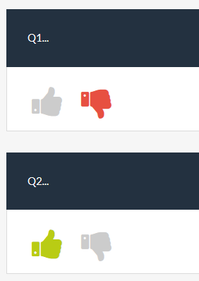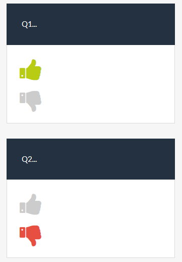 Code:.thumbs-question .answer-container { padding-top: 1em; } .thumbs-question .radio label, .checkbox label { min-height: 48px; line-height: 48px; margin: 10px 0; } .thumbs-question .radio label::before { background-color: transparent; border: 0 none; border-radius: 0; height: auto; width: auto; left: 0; transition: all 0.15s ease-in-out 0s; font-family: FontAwesome; font-size: 48px; content: "\f164"; color: #CCC; } .thumbs-question .radio-list .answer-item.radio:nth-child(2) label::before { content: "\f165"; } .thumbs-question .radio label:hover::before { color: #b9cc14; opacity: 0.5; filter: alpha(opacity=50); } .thumbs-question .radio-list .answer-item.radio:nth-child(2) label:hover::before { color: #e75041; } .thumbs-question .radio input[type="radio"]:checked + label::before { color: #b9cc14; outline: none !important; opacity: 1; filter: alpha(opacity=100); } .thumbs-question .radio-list .answer-item.radio:nth-child(2) input[type="radio"]:checked + label::before { color: #e75041; } .thumbs-question .radio label::after { display: none; }