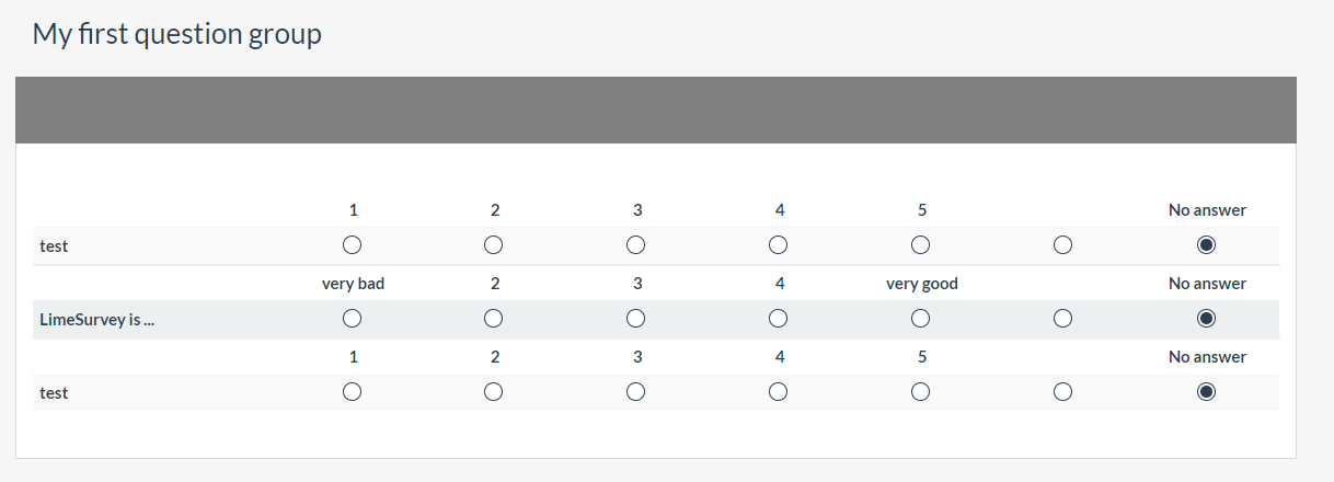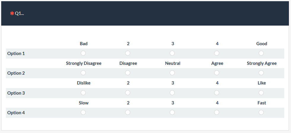 <script type="text/javascript" charset="utf-8"> $(document).ready(function() { // Identify this question var qID = {QID}; var thisQuestion = $('#question'+qID); // Insert new header rows $('table.subquestion-list thead tr:eq(0)', thisQuestion).addClass('header-row'); var headerRow = $('.header-row:eq(0)', thisQuestion).clone(); $('tr.answers-list', thisQuestion).before($(headerRow).clone()); // Define the column labels for the inserted header rows var headerLabels = { 'SQ001': ['Bad', '2', '3', '4', 'Good'], 'SQ002': ['Strongly Disagree', 'Disagree', 'Neutral', 'Agree', 'Strongly Agree'], 'SQ003': ['Dislike', '2', '3', '4', 'Like'], 'SQ004': ['Slow', '2', '3', '4', 'Fast'] } // Insert the labels $.each(headerLabels, function(i, values) { var thisAnswerRow = $('tr.answers-list[id$="X'+qID+i+'"]'); var thisHeaderRow = $(thisAnswerRow).prevAll('.header-row:eq(0)'); $.each(values, function(i, val) { $('th:eq('+(i+1)+')', thisHeaderRow).text(val); $('.answer-item:eq('+i+') div.label-text', thisAnswerRow).text(val); }); }); // Fix up the styles $('tr.answers-list', thisQuestion).removeClass('array2').addClass('array1'); var newStyles = 'table.subquestion-list thead {\ display: none;\ }\ table.subquestion-list tbody tr.header-row th {\ padding-top: 2em;\ }\ @media only screen and (max-width: 801px) {\ .header-row {\ display: none !important;\ }\ }'; $('head').append('<style type="text/css">'+newStyles+'</style>'); }); </script>