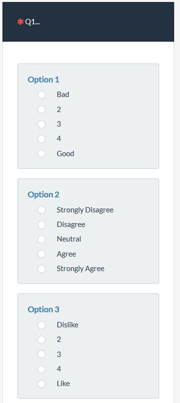 <script type="text/javascript" charset="utf-8"> $(document).ready(function() { // Identify this question var qID = {QID}; var thisQuestion = $('#question'+qID); // Insert new header rows $('table.subquestion-list thead tr:eq(0)', thisQuestion).addClass('header-row'); var headerRow = $('.header-row:eq(0)', thisQuestion).clone(); $('tr.answers-list:not(:first)', thisQuestion).before($(headerRow).clone()); // Define the column labels for the inserted header rows var headerLabels = { 1: ['Strongly Disagree', 'Disagree', 'Neutral', 'Agree', 'Strongly Agree'], 2: ['Dislike', '2', '3', '4', 'Like'], 3: ['Slow', '2', '3', '4', 'Fast'] } // Insert the labels $.each(headerLabels, function(i, values) { var thisHeaderRow = $('.header-row:eq('+i+')', thisQuestion); var thisAnswerRow = $(thisHeaderRow).nextAll('tr.answers-list:eq(0)'); $.each(values, function(i, val) { $('th:eq('+(i+1)+')', thisHeaderRow).text(val); $('.answer-item:eq('+i+') div.label-text', thisAnswerRow).text(val); }); }); // Fix up the styles $('tr.answers-list', thisQuestion).removeClass('array2').addClass('array1'); var newStyles = '@media only screen and (max-width: 801px) {\ .header-row {\ display: none !important;\ }\ }'; $('head').append('<style type="text/css">'+newStyles+'</style>'); }); </script>