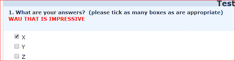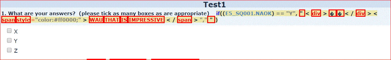 {if(( E5_SQ001.NAOK)== "Y","<div></div><span style=color:#ff0000;>WAU THAT IS IMPRESSIVE</span>","")}