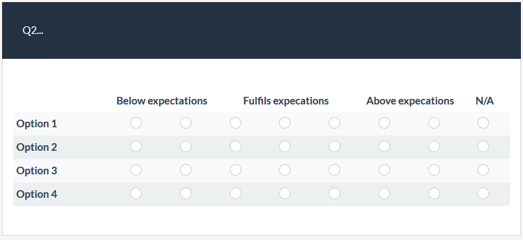<script type="text/javascript" charset="utf-8"> $(document).on('ready pjax:complete',function() { // Identify this question var thisQuestion = $('#question{QID}'); // Label for columns 6-7 (column-7 label spans 2 columns) $('thead th:eq(7)', thisQuestion).prop('colspan', 2).prev().remove(); // Label for columns 3-5 (column-4 label spans 3 columns) $('thead th:eq(4)', thisQuestion).prop('colspan', 3).next().remove(); $('thead th:eq(4)', thisQuestion).prev().remove(); // Label for columns 1-2 (column-1 label spans 2 columns) $('thead th:eq(1)', thisQuestion).prop('colspan', 2).next().remove(); }); </script>