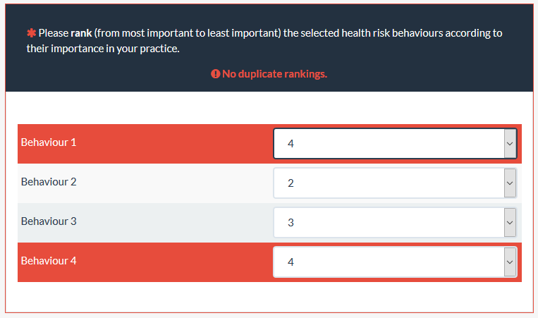 If people mistakenly select the same rankings twice and click next (because they don't notice the No duplicate rankings message), is it possible to mark the subquestions with the same rankings in red? Or is it possible to mark them in red while they are still ranking subquestions? Just to make it more noticeable for them.