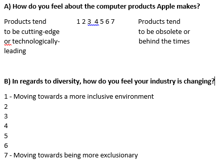 Much of the form uses a modified, unmarked semantic differential scale with a 7-point continuum (where 1/2/3/4/5/6/7 is being used as opposed to 3/2/1/0/1/2/3). Most individual questions have a unique stem and stem-specific extremes on the opposing ends of the answer continuum - so an answer grid/matrice would not be possible for most of the questions. Further, some of the labels for the extremes on each side of the continuum are long (and are not always polar opposites – so it is even more important that R be able to clearly read both ends). This is complicated by the knowledge that many R's will complete this form on a mobile device, so something that displays the scale portion vertically (such as Example