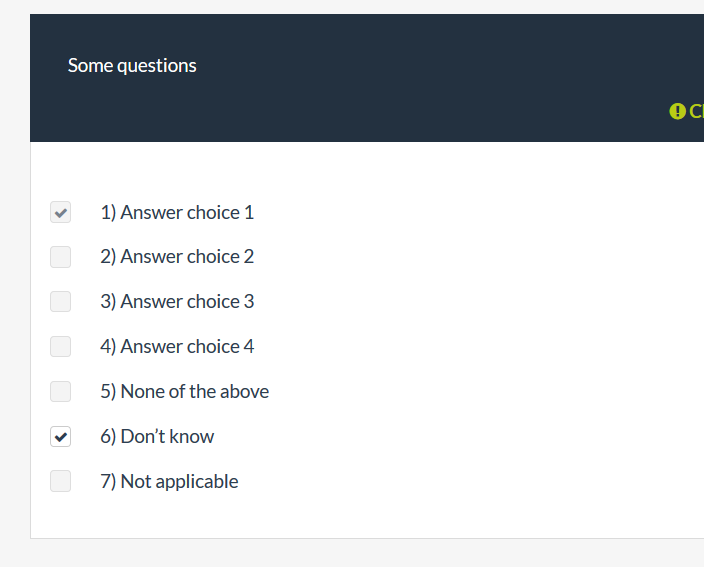 <script type="text/javascript" charset="utf-8"> $(document).ready(function() { // Identify this question var thisQuestion = $('#question{QID}'); // Add some classes $('.question-item:not(:gt(3))', thisQuestion).addClass('non-exclusive-item'); $('.question-item:gt(3)', thisQuestion).addClass('exclusive-item'); // Handle exclusive items $('input.checkbox', thisQuestion).on('change', function(e) { if($(this).is(':checked')) { var actionItems = $('.question-item', thisQuestion).not($(this).closest('.question-item')); if($(this).closest('.question-item').hasClass('non-exclusive-item')) { actionItems = $('.exclusive-item', thisQuestion); } actionItems.each(function(i) { $('input.checkbox', this).prop('checked', false).trigger('change'); $('input:hidden', this).attr('value', ''); $('input[type="text"]', this).val('').trigger('keyup'); }); } }); }); </script>