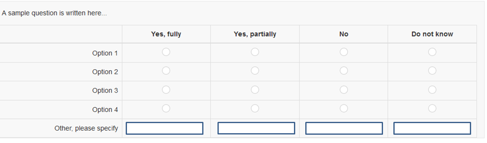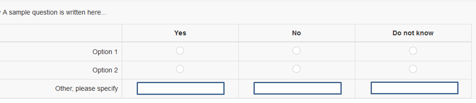 Can you attach a small sample survey?Can you please help with two other variations of such a question, but when the "Other" textboxes are located horizontally?