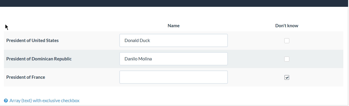 <script type="text/javascript" charset="utf-8"> $(document).ready(function(){ // Identify this question var qID = {QID}; var thisQuestion = $('#question'+qID); // Add some classes $(thisQuestion).addClass('with-exclusive-items'); $('td.answer-item', thisQuestion).addClass('non-exclusive-item'); // Loop through the last-column cells $('td.answer-item:last-child', thisQuestion).each(function(i) { varThisID = $('input[type="text"]', this).attr('id'); // Add a class $(this).removeClass('non-exclusive-item').addClass('exclusive-item'); // Hide the text input $('td.answer-item:last-child input[type="text"]', thisQuestion).hide(); // Insert checkboxes $(this).append('<div class="checkbox">\ <input class="checkbox" name="" id="'+varThisID+'_cbox" value="N/A" type="checkbox">\ <label for="'+varThisID+'_cbox" class="answertext inserted-label"></label>\ </div>'); }); // Listener on the checkboxes $('.exclusive-item input[type="checkbox"]', thisQuestion).on('change', function(e) { var thisRow = $(this).closest('tr.subquestion-list'); var thisCell = $(this).closest('td.answer-item'); if($(this).is(':checked')) { $('input[type="text"]', thisCell).val('1'); $('.non-exclusive-item input[type="text"]', thisRow).val(''); } else { $('input[type="text"]', thisCell).val(''); } // Fire Expression Manager $('input[type="text"]', thisRow).each(function(i) { $(this).trigger('keyup'); }); }); // Listener on the text inputs $('.non-exclusive-item input[type="text"]', thisQuestion).on('keyup change', function(e) { var thisRow = $(this).closest('tr.subquestion-list'); if($.trim($(this).val()) != '') { $('.exclusive-item input[type="checkbox"]', thisRow).prop('checked',false); $('.exclusive-item input[type="text"]', thisRow).val(''); } // Fire Expression Manager $('.exclusive-item input[type="text"]', thisRow).trigger('keyup'); }); // Insert some styles (these could be in template.css) // For the LS 2.67 default template var newStyles = '.with-exclusive-items thead th.answertext {\ text-align: center;\ }\ .with-exclusive-items .exclusive-item {\ text-align: center;\ vertical-align: middle;\ cursor: pointer;\ }\ .with-exclusive-items .checkbox {\ padding-left: 0;\ }\ .with-exclusive-items .inserted-label {\ width: 24px;\ min-height: 24px;\ padding: 0;\ }\ .with-exclusive-items .inserted-label::before {\ margin: 4px 0 0 4px;\ }\ .with-exclusive-items .inserted-label::after {\ margin: 4px 0 0 4px;\ }'; $('head').append('<style type="text/css">'+newStyles+'</style>'); }); </script>