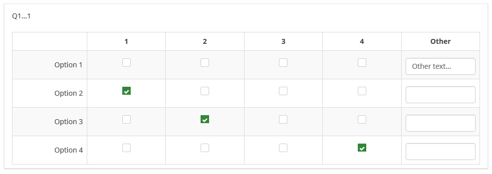 Can you attach a small sample survey?Can you please help with two other variations of such a question, but when the "Other" textboxes are located horizontally?