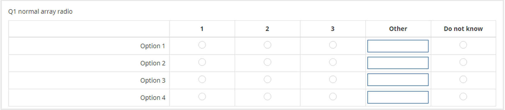 Code:$(document).on('ready pjax:scriptcomplete',function(){ // Apply the plugin to specific arrays $('.array-multi-flexi.with-checkbox-array-comments').cbArrayComments(); }); // A jQuery plugin insert comments into checkbox arrays (function( $ ){ $.fn.cbArrayComments = function(options) { var opts = $.extend( { }, options); return this.each(function() { // Identify the questions var thisQuestion = $(this); var q1ID = $(thisQuestion).attr('id').replace(/question/, ''); var thisQuestion = $('#question'+q1ID); var nextQuestion = thisQuestion.nextAll('.multiple-short-txt:eq(0)'); var q2ID = $(nextQuestion).attr('id').replace(/question/, ''); //Hide the multiple-short-text nextQuestion.hide(); // Move the text inputs $('tr.subquestion-list', thisQuestion).each(function(i) { var thisCode = $(this).attr('id').split('X')[2].split(q1ID)[1]; $('td.answer-item:last input[type="checkbox"]', this).css({ 'position': 'absolute', 'left': '-9999em' }); $('td.answer-item:last', this).removeClass('checkbox-item').addClass('inserted-text-item').append($('input[type="text"][id$="X'+q2ID+thisCode+'"]', nextQuestion)); }); // Listeners on the text inputs $('input[type="text"]', thisQuestion).on('keyup change', function(e) { var thisCheckbox = $(this).closest('td').find('input[type="checkbox"]'); if($.trim($(this).val()) != '') { $(thisCheckbox).prop('checked', true); $(thisCheckbox).prev('input:hidden').val(1); } else { $(thisCheckbox).prop('checked', false); $(thisCheckbox).prev('input:hidden').val(''); } // Fire Expression manager $(thisCheckbox).trigger('change'); }); }); }; })( jQuery );