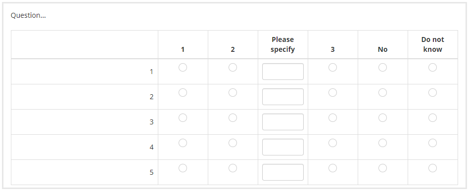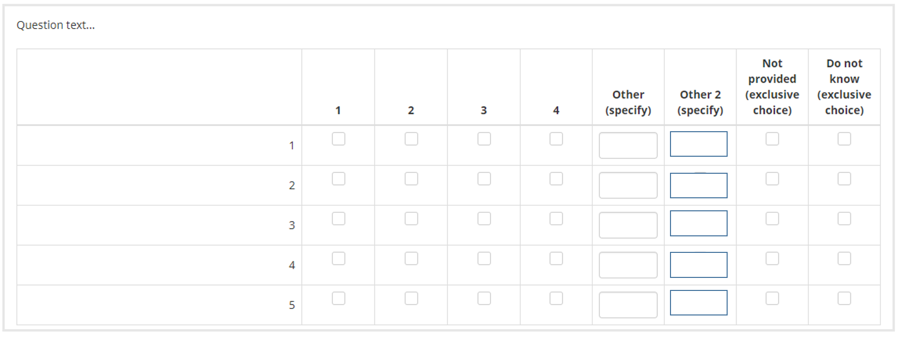 Code:<script type="text/javascript" charset="utf-8"> $(document).on('ready pjax:scriptcomplete',function(){ // Identify this question var thisQuestion = $('#question{QID}'); // Column-specific classes $('tr.subquestion-list', thisQuestion).each(function(i) { $('th, td', this).each(function(i) { $(this).addClass('column-'+i); }); }); // Insert checkboxes $('.answer-item.column-1, .answer-item.column-2, .answer-item.column-3, .answer-item.column-4, .answer-item.column-7, .answer-item.column-8', thisQuestion).addClass('custom-checkbox-item'); $('.custom-checkbox-item', thisQuestion).each(function(i) { var thisID = $('input:text:eq(0)', this).attr('id'); $('label', this).before('<input class="" id="'+thisID+'" value="Y" type="checkbox" name="'+thisID.replace(/answer/, '')+'" />'); if($('input:text:eq(0)', this).val() == 'Y') { $('input:checkbox:eq(0)', this).prop('checked', true); } $(this).removeClass('text-item').addClass('checkbox-item'); $('input:text:eq(0)', this).remove(); }); // Identify exclusive items $('.answer-item.column-1, .answer-item.column-2, .answer-item.column-3, .answer-item.column-4, .answer-item.column-5, .answer-item.column-6', thisQuestion).addClass('non-exclusive-item'); $('.answer-item.column-7, .answer-item.column-8', thisQuestion).addClass('exclusive-item'); // Listeners for exclusive items $('.non-exclusive-item input:checkbox', thisQuestion).on('change', function(e) { if($(this).is(':checked')) { $(this).closest('tr.subquestion-list').find('.exclusive-item input:checkbox').prop('checked', false); } }); $('.non-exclusive-item input:text', thisQuestion).on('keyup change', function(e) { if($.trim($(this).val()) != '') { $(this).closest('tr.subquestion-list').find('.exclusive-item input:checkbox').prop('checked', false); } }); $('.exclusive-item input:checkbox', thisQuestion).on('change', function(e) { if($(this).is(':checked')) { var thisItem = $(this).closest('.answer-item'); $(this).closest('tr.subquestion-list').find('.answer-item').not(thisItem).find('input:checkbox').prop('checked', false); $(this).closest('tr.subquestion-list').find('input:text').val(''); } }); }); </script>
