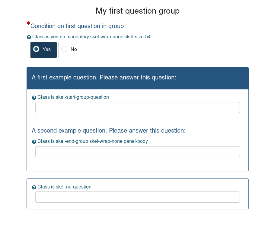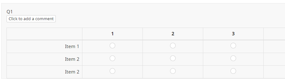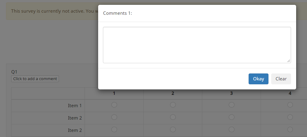 <script type="text/javascript" charset="utf-8"> $(document).on('ready pjax:scriptcomplete',function(){ // Identify the questions var qArrayID = {QID}; var qArray = $('#question'+qArrayID); var arrayLength = $('tr.answers-list', qArray).length; var qComments = qArray.nextAll('.text-long:lt('+arrayLength+')'); // Add some classes qArray.addClass('array-with-comments-question'); $(qComments).each(function(i) { $(this).addClass('comments-question index-'+i).css({ 'position': 'absolute', 'left': '-9999em' }); }); // Handle comments $(qComments).each(function(i) { // Create modals $('body').append('<div class="modal comments-modal" id="comments-'+qArrayID+'-'+(i+1)+'" tabindex="-1" role="dialog">\ <div class="modal-dialog" role="document">\ <div class="modal-content">\ <div class="modal-header">\ <h5 class="modal-title">'+$('.ls-label-question', this).html()+'</h5>\ </div>\ <div class="modal-body">\ </div>\ <div class="modal-footer">\ <button type="button" class="btn btn-primary" data-bs-dismiss="modal">Okay</button>\ <button type="button" class="btn btn-secondary" data-bs-dismiss="modal">Clear</button>\ </div>\ </div>\ </div>\ </div>'); // Move textareas into modals $('#comments-'+qArrayID+'-'+(i+1)+' .modal-body').append($('textarea', this)); // Modal button events $('#comments-'+qArrayID+'-'+(i+1)+' .modal-footer .btn-secondary').on('click', function(e) { $('#comments-'+qArrayID+'-'+(i+1)+' textarea').val(''); }); }); // Interrupt the Next/Submit function (to put comments back in the form) $('#limesurvey').submit(function(e) { $('.comments-modal[id^="comments-'+qArrayID+'-"]').each(function(i) { var qID = $('textarea:eq(0)', this).attr('id').split('X')[2]; $('#question'+qID+' .answer-item:eq(0)').append($('textarea:eq(0)', this)); }); }); }); </script>