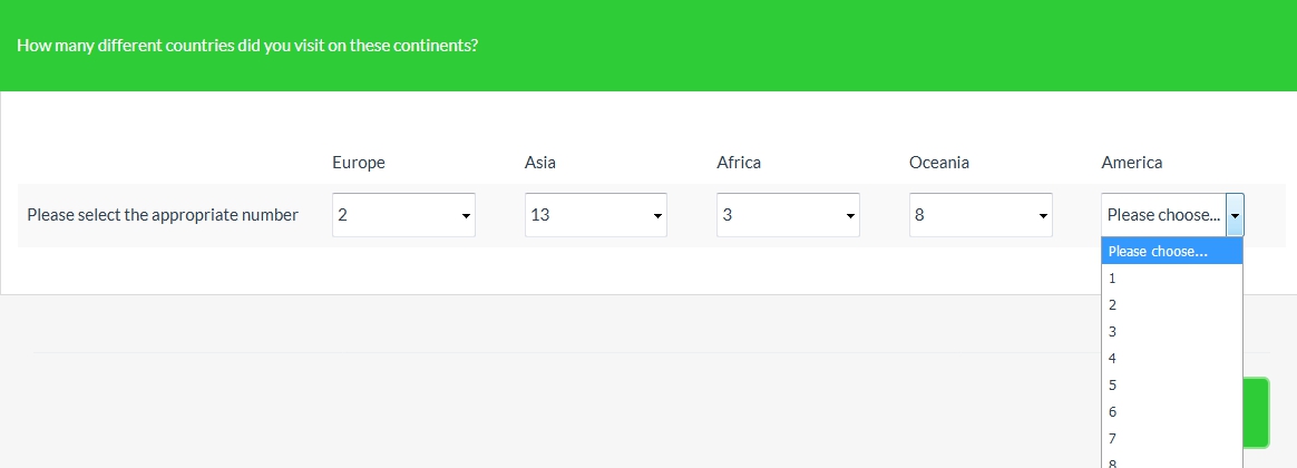 Asia: [DROPDOWN with numbers from 0 to number of asian countries]