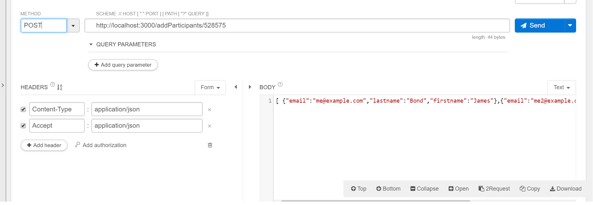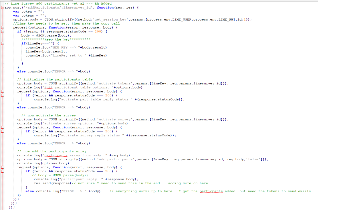 I am trying to make the add_participants API call using node.js and express. It's adding the participants, but I am not getting the array back in the response from the post. I get an OK code back .