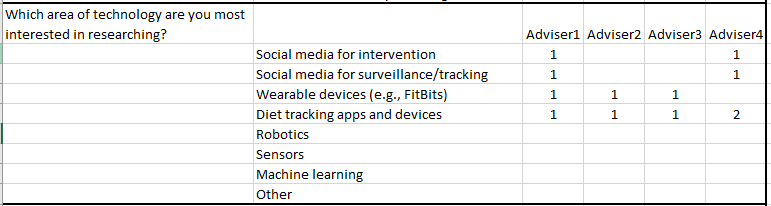 I think the graphic is simply to indicate which advisors get a point for each answer and that there are seven more similar list-radio questions. In that case, you would need to sum the results from all questions as my abbreviated example indicates.You don't need to sum anything. You just check which item is answered and then write the name of the advisors.