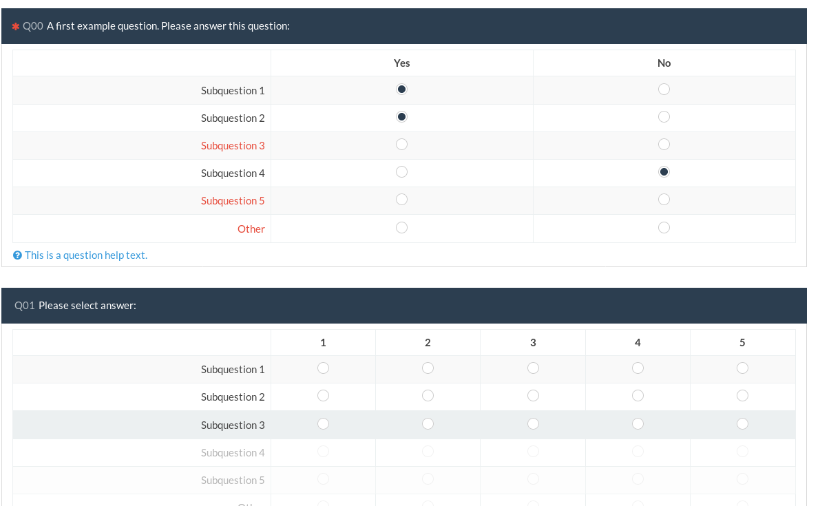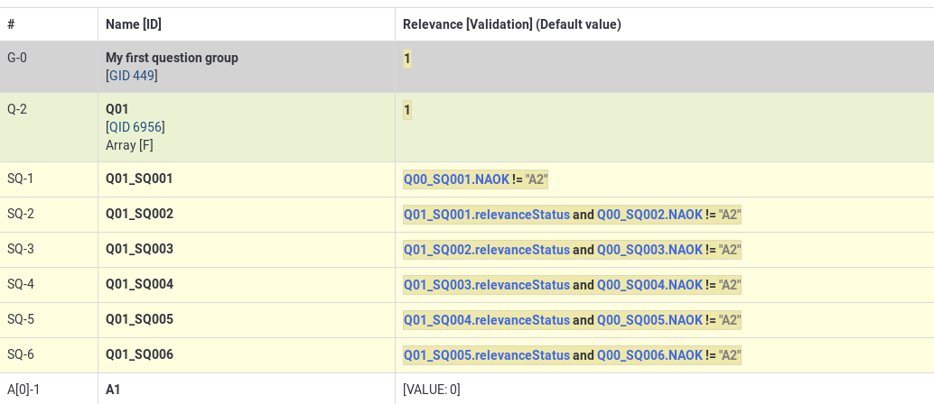 are REALLY unclear …Q00 > SQ001 - NO then in table Q01, Q02 > SQ001 will turn off/disable/inactive.