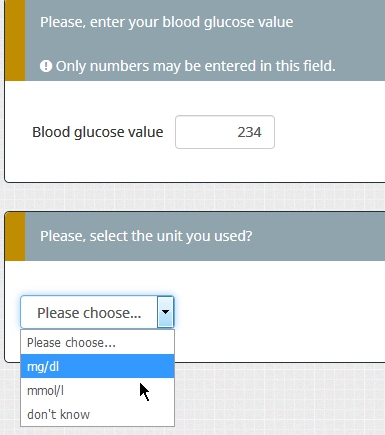 First we want to ask the blood glucose value and beside this question we want them to indicate which value they presented us (mmol/l, mg/dl or don't know).