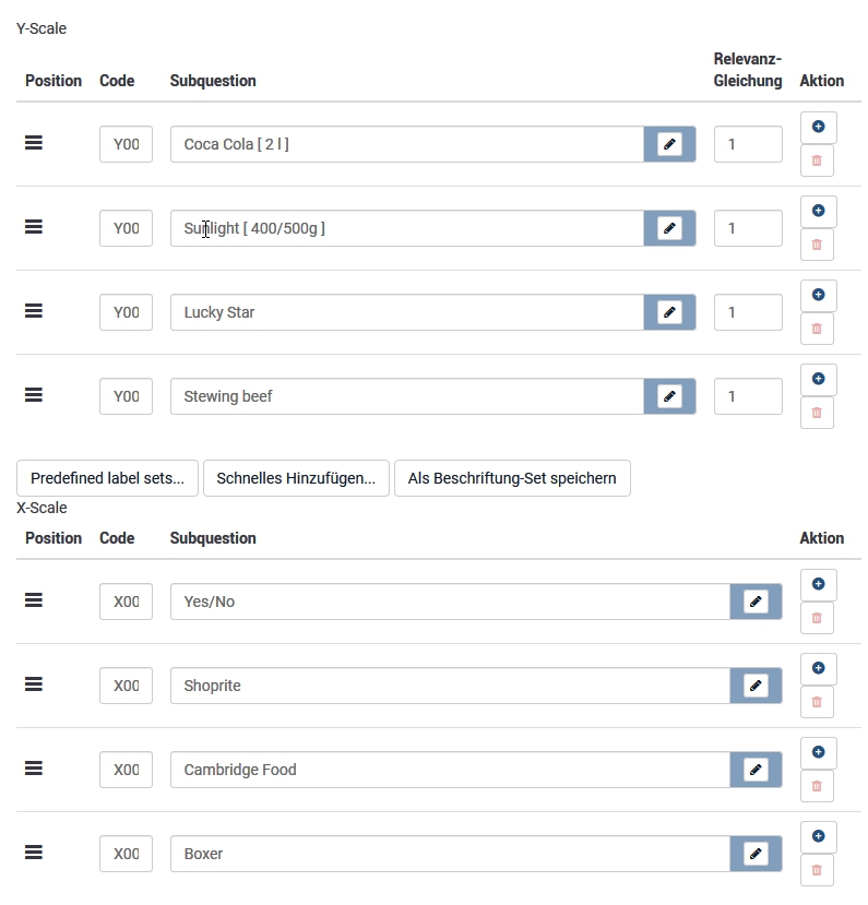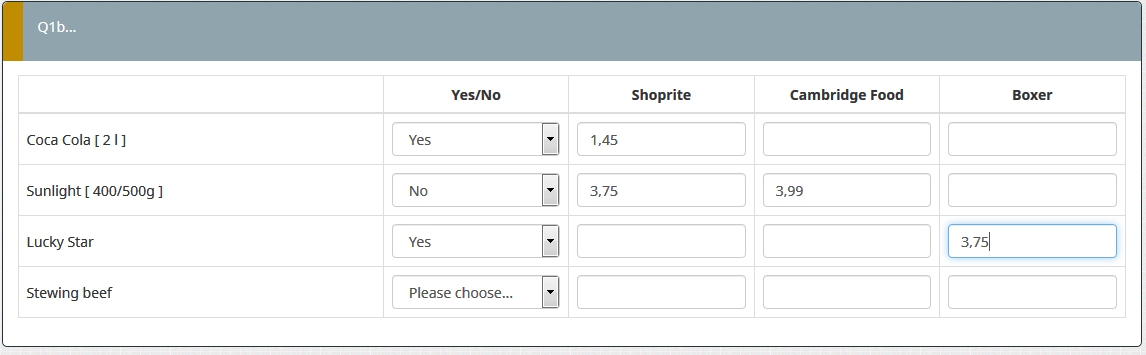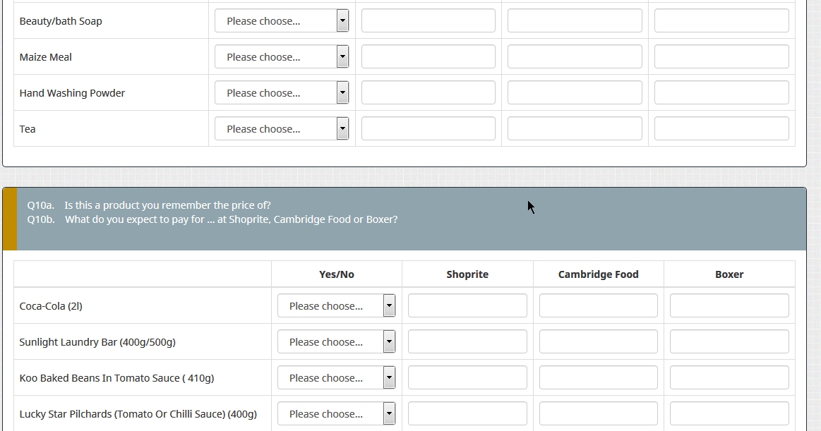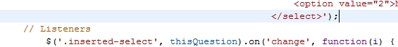 <script type="text/javascript" charset="utf-8"> $(document).on('ready pjax:scriptcomplete',function(){ var thisQuestion = $('#question{QID}'); // Insert selects $('.answer-item.answer_cell_X001', thisQuestion).addClass('with-select').append('<select class="inserted-select form-control list-question-select">\ <option value="">Please choose...</option>\ <option value="1">Yes</option>\ <option value="2">No</option>\ <option value="3">Do not know</option>\ </select>'); $('.answer-item.answer_cell_X002', thisQuestion).addClass('with-select').append('<select class="inserted-select form-control list-question-select">\ <option value="">Please choose...</option>\ <option value="1">Red</option>\ <option value="2">Blue</option>\ <option value="3">Pink</option>\ <option value="3">Purple</option>\ </select>'); $('.answer-item.answer_cell_X005', thisQuestion).addClass('with-select').append('<select class="inserted-select form-control list-question-select">\ <option value="">Please choose...</option>\ <option value="1">AAA</option>\ <option value="2">BBB</option>\ <option value="3">Do not know</option>\ </select>'); $('.answer-item.answer_cell_X006', thisQuestion).addClass('with-select').append('<select class="inserted-select form-control list-question-select">\ <option value="">Please choose...</option>\ <option value="1">AAA</option>\ <option value="2">BBB</option>\ <option value="3">Do not know</option>\ </select>'); // Listeners $('.inserted-select', thisQuestion).on('change', function(i) { if($(this).val() != '') { $(this).closest('.answer-item').find('input:text').val($.trim($('option:selected', this).text())).trigger('change'); } else { $(this).closest('.answer-item').find('input:text').val('').trigger('change'); } }); // Returning to page $('.with-select input:text', thisQuestion).each(function(i) { var thisCell = $(this).closest('.answer-item'); var inputText = $.trim($(this).val()); var selectval = $('select.inserted-select option', thisCell).filter(function () { return $(this).html() == inputText; }).val(); $('select.inserted-select', thisCell).val(selectval); }); // Clean-up styles $('select.inserted-select', thisQuestion).css({ 'max-width': '100%' }); $('.with-select input:text', thisQuestion).css({ 'position': 'absolute', 'left': '-9999em' }); }); </script>
