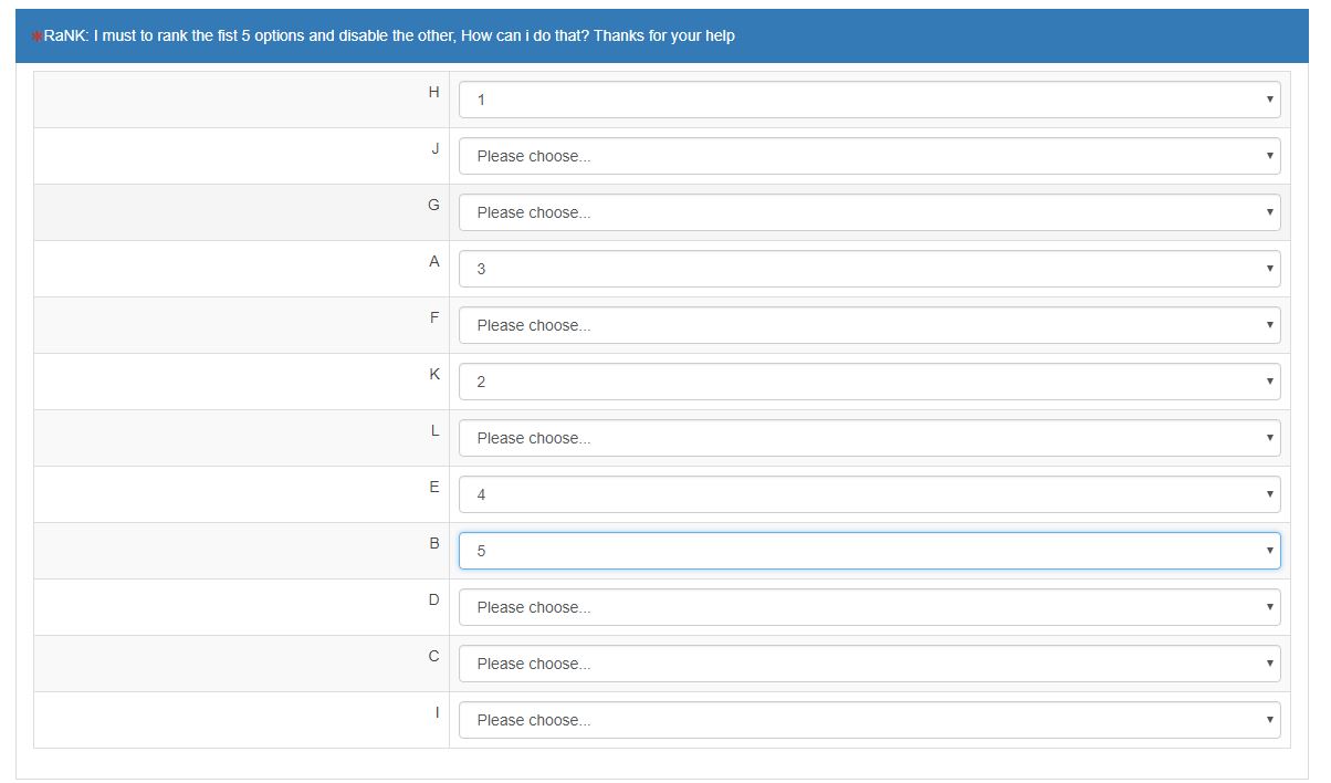 I have a rank question with a bunch of options, so i have to randomize the options and disable the other options after the customer fill, rank or select the first 5.