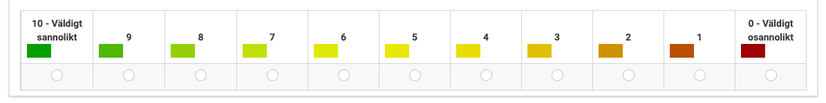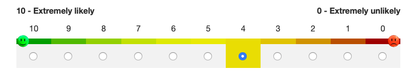 <style type="text/css"> .custom-array table.subquestion-list thead td, .custom-array table.subquestion-list thead th { border-bottom-width: 8px; border-bottom-style: solid; } .custom-array table.subquestion-list thead .column-1 { border-bottom-color: #00A800; } .custom-array table.subquestion-list thead .column-2 { border-bottom-color: #5AC100; } .custom-array table.subquestion-list thead .column-3 { border-bottom-color: #9DD600; } .custom-array table.subquestion-list thead .column-4 { border-bottom-color: #9CE400; } .custom-array table.subquestion-list thead .column-5 { border-bottom-color: #E2EC00; } .custom-array table.subquestion-list thead .column-6 { border-bottom-color: #ECEC00; } .custom-array table.subquestion-list thead .column-7 { border-bottom-color: #ECE200; } .custom-array table.subquestion-list thead .column-8 { border-bottom-color: #E4C900; } .custom-array table.subquestion-list thead .column-9 { border-bottom-color: #D69D00; } .custom-array table.subquestion-list thead .column-10 { border-bottom-color: #C15A00; } .custom-array table.subquestion-list thead .column-11 { border-bottom-color: #A80200; } .custom-array td.column-1:hover, .custom-array td.active-item.column-1 { background-color: #00A800; } .custom-array td.column-2:hover, .custom-array td.active-item.column-2 { background-color: #5AC100; } .custom-array td.column-3:hover, .custom-array td.active-item.column-3 { background-color: #9DD600; } .custom-array td.column-4:hover, .custom-array td.active-item.column-4 { background-color: #9CE400; } .custom-array td.column-5:hover, .custom-array td.active-item.column-5 { background-color: #E2EC00; } .custom-array td.column-6:hover, .custom-array td.active-item.column-6 { background-color: #ECEC00; } .custom-array td.column-7:hover, .custom-array td.active-item.column-7 { background-color: #ECE200; } .custom-array td.column-8:hover, .custom-array td.active-item.column-8 { background-color: #E4C900; } .custom-array td.column-9:hover, .custom-array td.active-item.column-9 { background-color: #D69D00; } .custom-array td.column-10:hover, .custom-array td.active-item.column-10 { background-color: #C15A00; } .custom-array td.column-11:hover, .custom-array td.active-item.column-11 { background-color: #A80200; } </style>