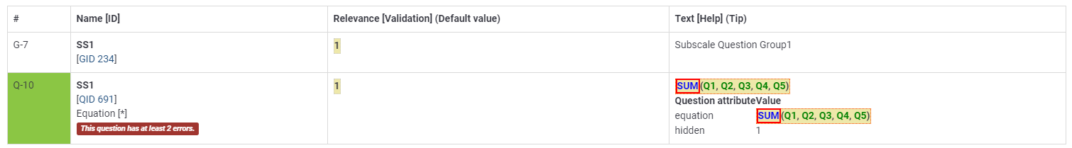 I want to simply add the results of a set of questions within another question (which will be hidden) so it will show up in the database. So if I have Q1, Q2, Q3, Q4, and Q5 which are all Question Type: List (radio) and the resulting answers will show numbers 1-5 for each of the answers selected I would like Field T1 (Question Type: Equation) to include the sum of those numbers. I tried to input a couple of different options like Q1+Q2+Q3+Q4+Q5 or {SUM(Q1,Q2,Q3,Q4,Q5)} into the Question but the first one one sent me all the numbers not the totals and the second one has an error in the logic file which I have attached. I assume this equation goes in the Question field not in the Equation field but I have tried it in both places.