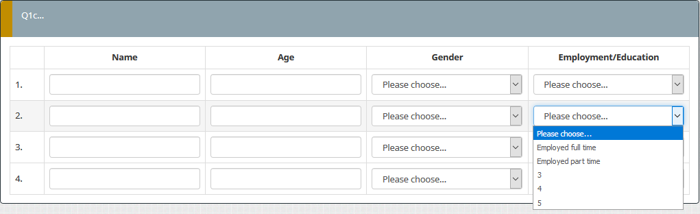 <script type="text/javascript" charset="utf-8"> $(document).ready(function() { var thisQuestion = $('#question{QID}'); // Insert selects $('.answer-item.answer_cell_00X003', thisQuestion).addClass('with-select').append('<select class="inserted-select form-control list-question-select">\ <option value="">Please choose...</option>\ <option value="1">male</option>\ <option value="2">female</option>\ <option value="3">other</option>\ <option value="4">DK/NA</option>\ </select>'); $('.answer-item.answer_cell_00X004', thisQuestion).addClass('with-select').append('<select class="inserted-select form-control list-question-select">\ <option value="">Please choose...</option>\ <option value="1">Employed full time</option>\ <option value="2">Employed part time</option>\ <option value="3">3</option>\ <option value="4">4</option>\ <option value="5">5</option>\ </select>'); // Listeners $('.inserted-select', thisQuestion).on('change', function(i) { var thisTextInput = $(this).closest('.answer-item').find('input:text'); if($(this).val() != '') { $(thisTextInput).val($.trim($('option:selected', this).text())).trigger('keyup');; } else { $(thisTextInput).val('').trigger('keyup'); } }); // Returning to page $('.with-select input:text', thisQuestion).each(function(i) { var thisCell = $(this).closest('.answer-item'); var inputText = $.trim($(this).val()); var selectval = $('select.inserted-select option', thisCell).filter(function () { return $(this).html() == inputText; }).val(); $('select.inserted-select', thisCell).val(selectval); }); // Clean-up styles $('select.inserted-select', thisQuestion).css({ 'max-width': '100%' }); $('.with-select input:text', thisQuestion).css({ 'position': 'absolute', 'left': '-9999em' }); }); </script>