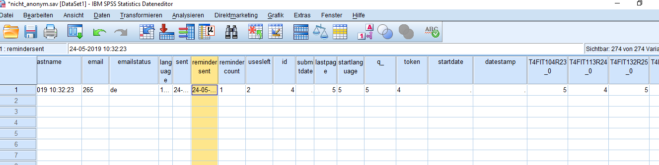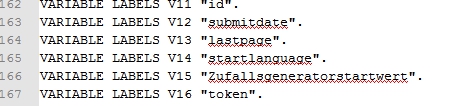 The syntax importfile might have the wrong length for the token variable and is cutting the token to length of one. The generated syntax file for importing into SPSS was seldom without bugs like this.Eule99 wrote: When i Export i face the following problem in the exported dataset only a single digit is displayed in the token variable in SPSS.