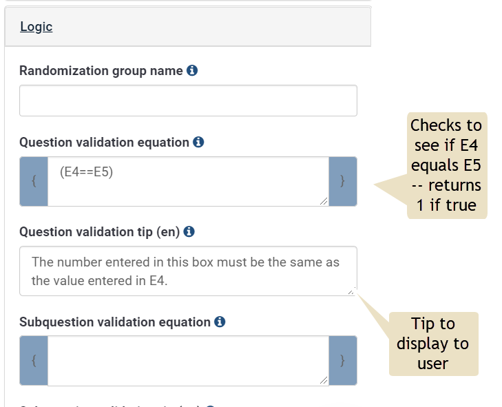 I see there is the question validation field -- but I gather this only allows for regular expression comparisions, but I need to just confirm that Q1 = Q2.