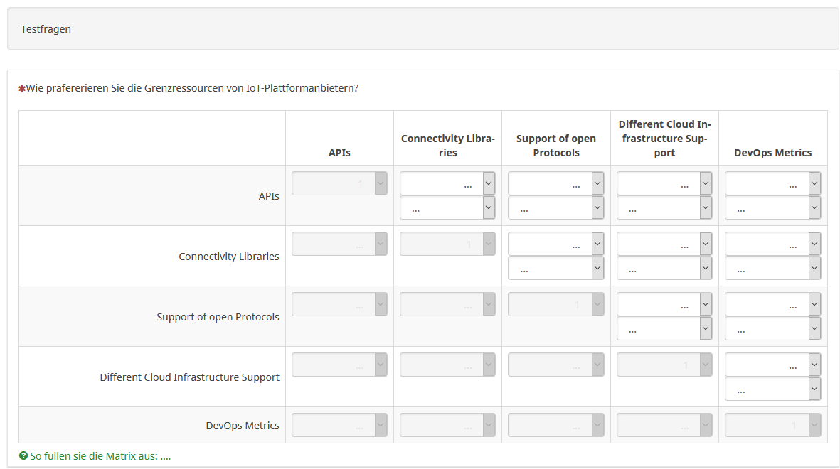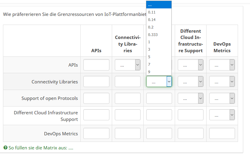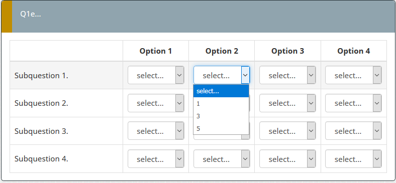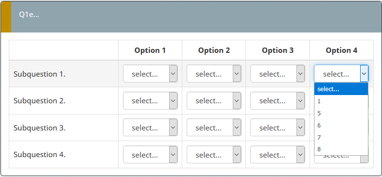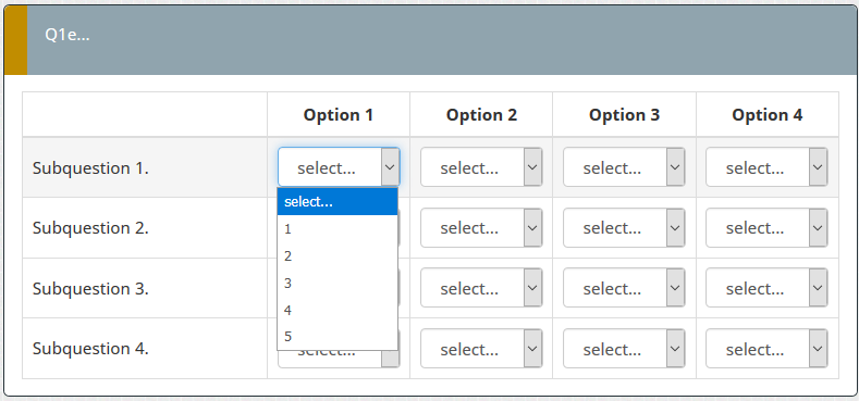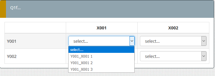<script type="text/javascript" charset="utf-8"> $(document).on('ready pjax:scriptcomplete',function(){ var thisQuestion = $('#question{QID}'); // Insert selects $('.answer-item.answer_cell_X001', thisQuestion).addClass('with-select').append('<select class="inserted-select form-control list-question-select">\ <option value="">select...</option>\ <option value="1">1</option>\ <option value="2">2</option>\ <option value="3">3</option>\ <option value="4">4</option>\ <option value="5">5</option>\ </select>'); $('.answer-item.answer_cell_X002', thisQuestion).addClass('with-select').append('<select class="inserted-select form-control list-question-select">\ <option value="">select...</option>\ <option value="1">1</option>\ <option value="3">3</option>\ <option value="5">5</option>\ </select>'); $('.answer-item.answer_cell_X003', thisQuestion).addClass('with-select').append('<select class="inserted-select form-control list-question-select">\ <option value="">select...</option>\ <option value="1">1</option>\ <option value="5">5</option>\ <option value="7">7</option>\ <option value="9">9</option>\ </select>'); $('.answer-item.answer_cell_X004', thisQuestion).addClass('with-select').append('<select class="inserted-select form-control list-question-select">\ <option value="">select...</option>\ <option value="1">1</option>\ <option value="5">5</option>\ <option value="6">6</option>\ <option value="7">7</option>\ <option value="8">8</option>\ </select>'); // Listeners $('.inserted-select', thisQuestion).on('change', function(i) { if($(this).val() != '') { $(this).closest('.answer-item').find('input:text').val($.trim($('option:selected', this).text())).trigger('change'); } else { $(this).closest('.answer-item').find('input:text').val('').trigger('change'); } }); // Returning to page $('.with-select input:text', thisQuestion).each(function(i) { var thisCell = $(this).closest('.answer-item'); var inputText = $.trim($(this).val()); var selectval = $('select.inserted-select option', thisCell).filter(function () { return $(this).html() == inputText; }).val(); $('select.inserted-select', thisCell).val(selectval); }); // Clean-up styles $('select.inserted-select', thisQuestion).css({ 'max-width': '100%' }); $('.with-select input:text', thisQuestion).css({ 'position': 'absolute', 'left': '-9999em' }); }); </script>