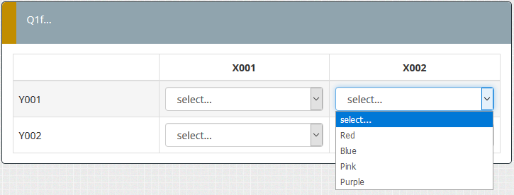 <script type="text/javascript" charset="utf-8"> $(document).on('ready pjax:scriptcomplete',function(){ var thisQuestion = $('#question{QID}'); // Insert selects $('#javatbd371969X110X18161Y001 .answer-item.answer_cell_X001', thisQuestion).addClass('with-select').append('<select class="inserted-select form-control list-question-select">\ <option value="">select...</option>\ <option value="1">Y001_X001 1</option>\ <option value="2">Y001_X001 2</option>\ <option value="3">Y001_X001 3</option>\ </select>'); $('#javatbd371969X110X18161Y001 .answer-item.answer_cell_X002', thisQuestion).addClass('with-select').append('<select class="inserted-select form-control list-question-select">\ <option value="">select...</option>\ <option value="1">Red</option>\ <option value="2">Blue</option>\ <option value="3">Pink</option>\ <option value="4">Purple</option>\ </select>'); $('#javatbd371969X110X18161Y002 .answer-item.answer_cell_X001', thisQuestion).addClass('with-select').append('<select class="inserted-select form-control list-question-select">\ <option value="">select...</option>\ <option value="1">AAA</option>\ <option value="2">BBB</option>\ <option value="3">CCC</option>\ </select>'); $('#javatbd371969X110X18161Y002 .answer-item.answer_cell_X002', thisQuestion).addClass('with-select').append('<select class="inserted-select form-control list-question-select">\ <option value="">select...</option>\ <option value="1">Y002_X002 1</option>\ <option value="2">Y002_X002 2</option>\ <option value="3">Y002_X002 3</option>\ </select>'); // Listeners $('.inserted-select', thisQuestion).on('change', function(i) { if($(this).val() != '') { $(this).closest('.answer-item').find('input:text').val($.trim($('option:selected', this).text())).trigger('change'); } else { $(this).closest('.answer-item').find('input:text').val('').trigger('change'); } }); // Returning to page $('.with-select input:text', thisQuestion).each(function(i) { var thisCell = $(this).closest('.answer-item'); var inputText = $.trim($(this).val()); var selectval = $('select.inserted-select option', thisCell).filter(function () { return $(this).html() == inputText; }).val(); $('select.inserted-select', thisCell).val(selectval); }); // Clean-up styles $('select.inserted-select', thisQuestion).css({ 'max-width': '100%' }); $('.with-select input:text', thisQuestion).css({ 'position': 'absolute', 'left': '-9999em' }); }); </script>