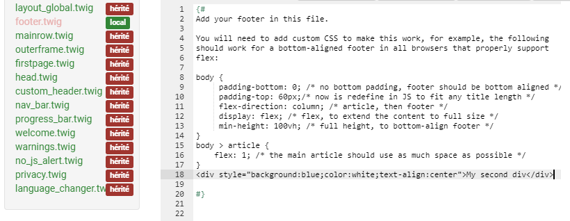 {# Add your footer in this file. You will need to add custom CSS to make this work, for example, the following should work for a bottom-aligned footer in all browsers that properly support flex: body { padding-bottom: 0; /* no bottom padding, footer should be bottom aligned */ padding-top: 60px;/* now is redefine in JS to fit any title length */ flex-direction: column; /* article, then footer */ display: flex; /* flex, to extend the content to full size */ min-height: 100vh; /* full height, to bottom-align footer */ } body > article { flex: 1; /* the main article should use as much space as possible */ } #} <div style="background:blue; color:white; text-align:center">My second div</div>