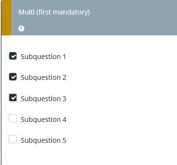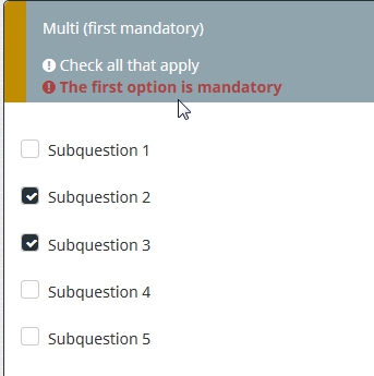 I would like to know if there is the opportunity to create a multiple choice question where the first answer option is mandatory. So I'm looking for an equation in the "Question validation equation" field, but I don't know how to set it in order to check if the user has selected, at least, the first answer option.